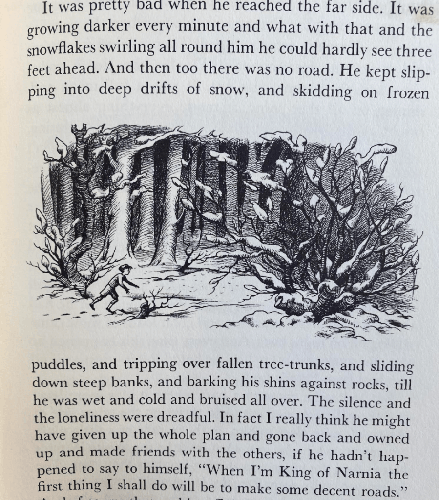 It is a landscape as treacherous as a bucolic, without good roads or modern infrastructure –if one understands that is a huge part of its enticing attraction. Baynes captures this lack of roads, amidst the falling snowflakes that mask what is ahead of oneself, as Edmund is left slipping into snowdrifts and skidding perilously on puddles–and imagines transforming, horrifically, to paved roads.
