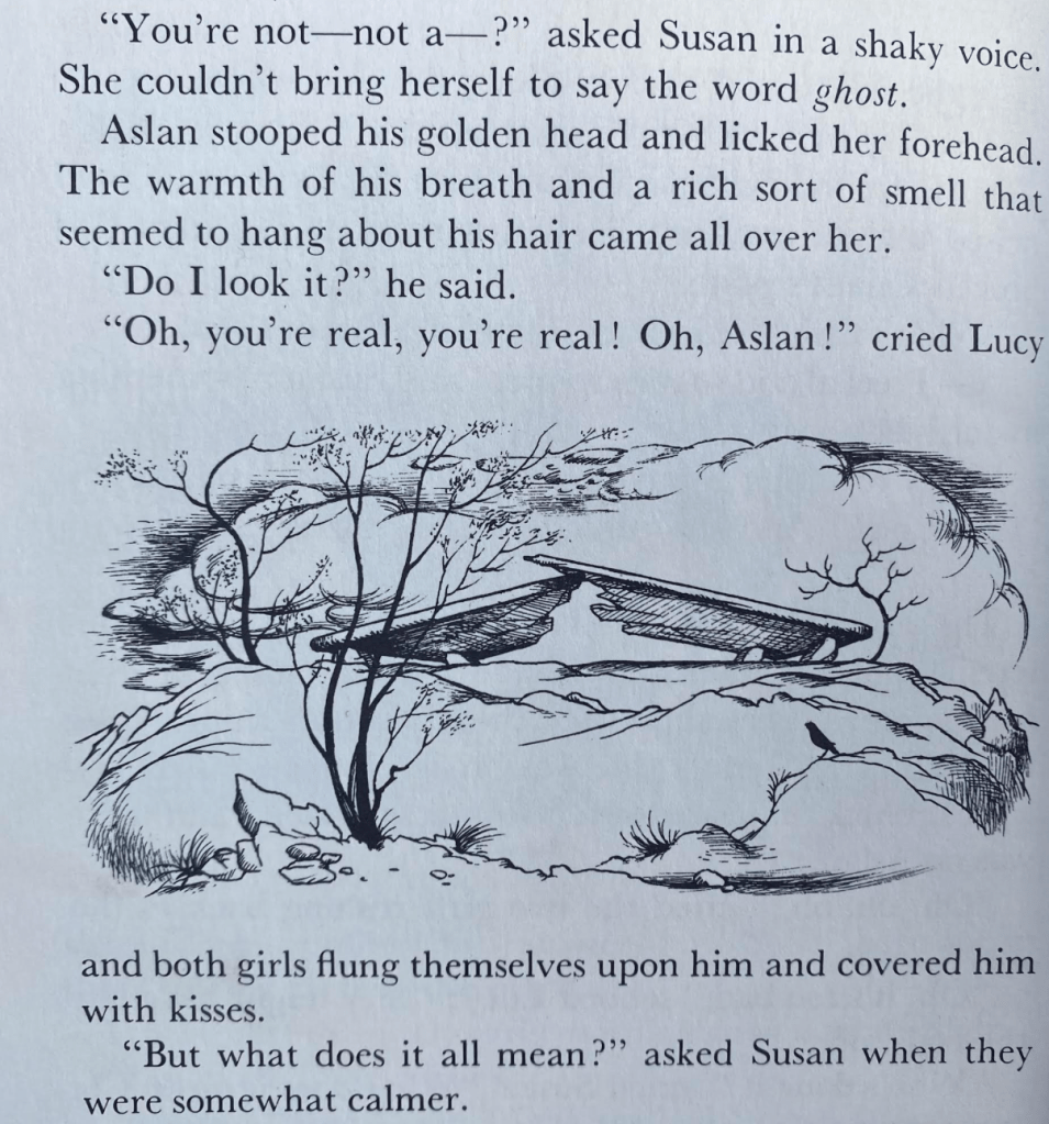 The culmination of the discovery of the Stone Table is also the site of remembering that this landscape is quite deeply real–not at all fantasy or illusion–as present to us as any, no matter what our instincts or rational tendencies might say. And the marker of the broken stone table, under the skies of Narnia, is likely to be lodged in our heads, no matter what it means to Lucy and Susan, as they are able to help restore Aslan to life, and allow this entire world to leave the Witch’s spell.