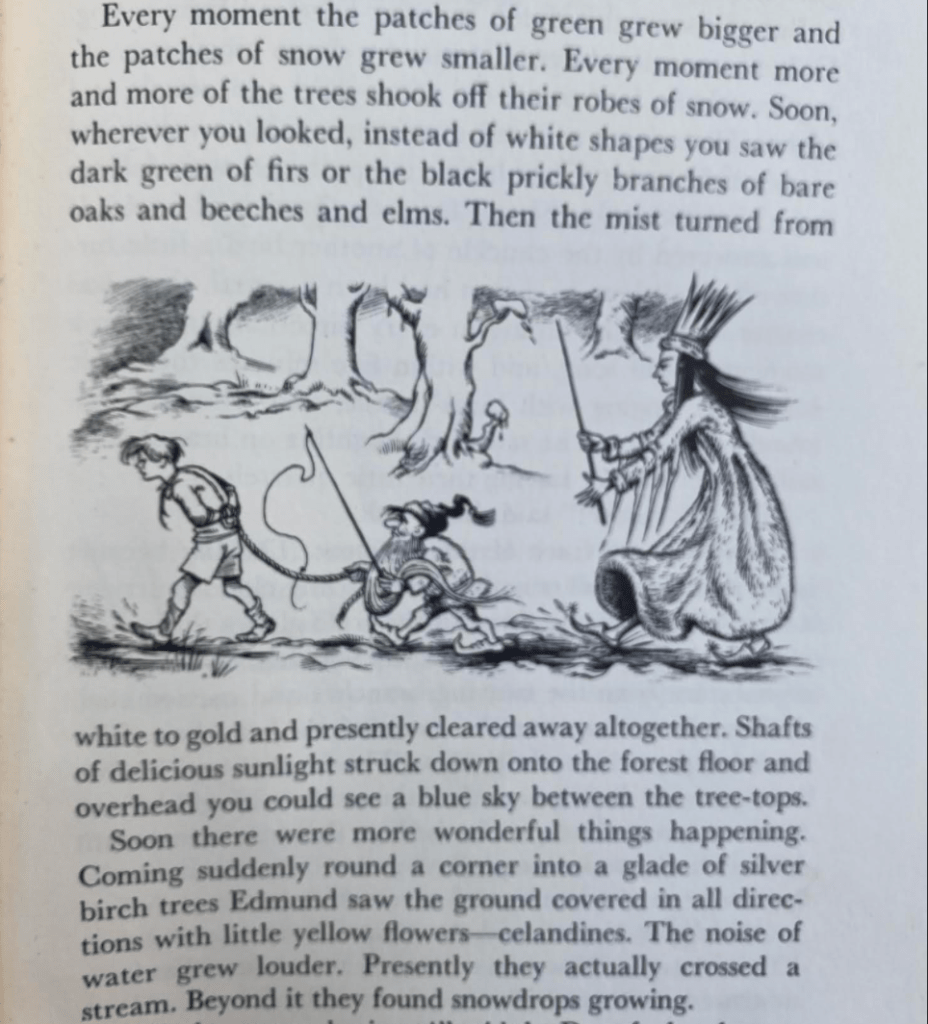 –and slipping into vainglorious thoughts, even as the landscape he trudges, reduced to a state of slavery to the Witch he is enthralled, suddenly starts to turn green, its drifts of snow clearing under an open and inviting blue sky where wonderful things might well improve, even for him, as he is being hurried along by a dwarf brandishing a whip, and a Witch who keeps yelling “Faster! Faster!”