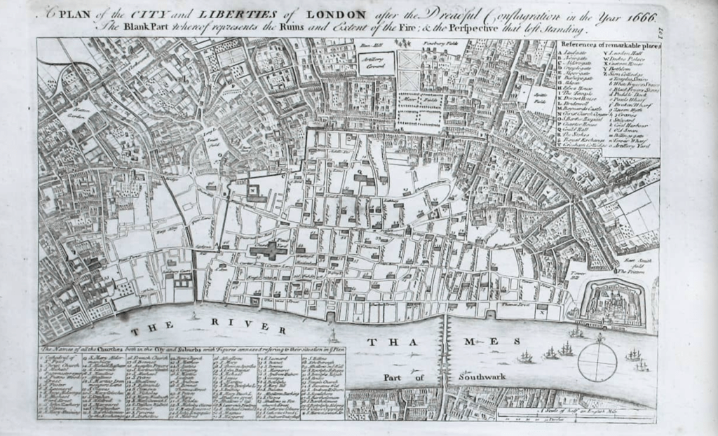 Franklin boosted public interest in the need for such insurance policies in best practices. He printed an anonymous letter, and perhaps penned it, arguing not only an end to “the detestable practice of putting wooden Mouldings on each side of the Fire Place,” ignoring their combustibility, by due diligence: “if Chimneys were more frequently and more carefully clean’d, some Fires might thereby be prevented,” leaving “People in Confidence that they are clean, making large Fires” and that ” in the Affair of Extinguishing Fires, tho’ we do not want Hands or Good-will, yet we seem to want Order and Method.” The Boston Fire Society existed from 1717, equipped with ladders, pails, engines and axes, to prevent fires’ spread, but it seems to have been made indelible by Defoe’s account of the scale of destruction of London’s 1666 Great Fire, and the mapping of the extent of the damages of the Great Fire, and indeed by 1744 the model for the rebuilding of London’s burned down center by Christopher Wren.