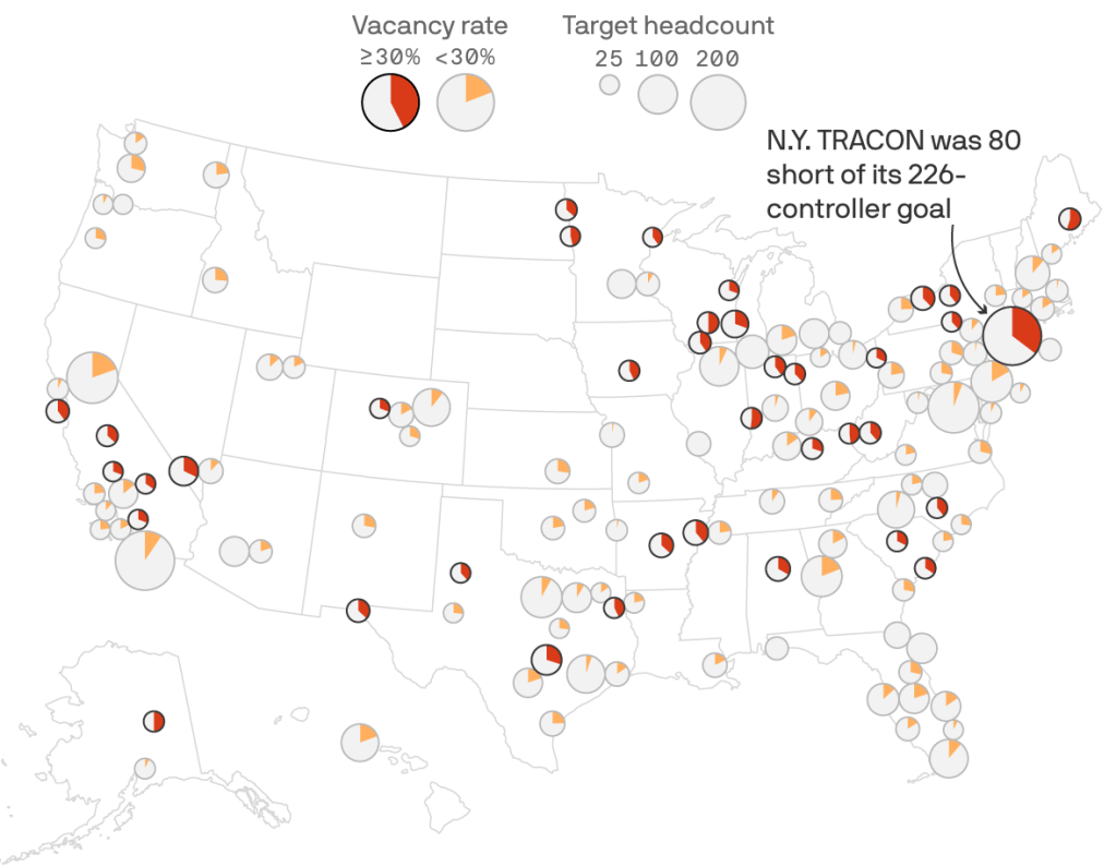Isn’t it a typical strategy of Trump to blame the poor training of airport workers for problems of ever-growing workloads, low wages, grueling hours of work that ask workers to cover multiple shifts, and overtime that undermines their performance? Air traffic control– as fire prevention–depends on the transmission of knowledge, and the knowledge loss is serious as cohorts air traffic controllers are constrained by being hired after age thirty-one and retiring at fifty-six years old, reducing the pool of knowledge for operating flight schedules to slim levels for coming decades.) Before the tragic accident occurred, 85% of post-pandemic air traffic control facilities were staffed below accepted thresholds, leaving shortfalls in the staffing of control towers in Dallas-Fort Worth, Atlanta, and Chicago, coordinating the busiest US airspace was an object of contention between the FAA and airlines, leading to cancellations and charges and counter-charges of inconsistent FAA hiring resulting–even as the airspace over the lower forty eight grew increasingly entangled.
