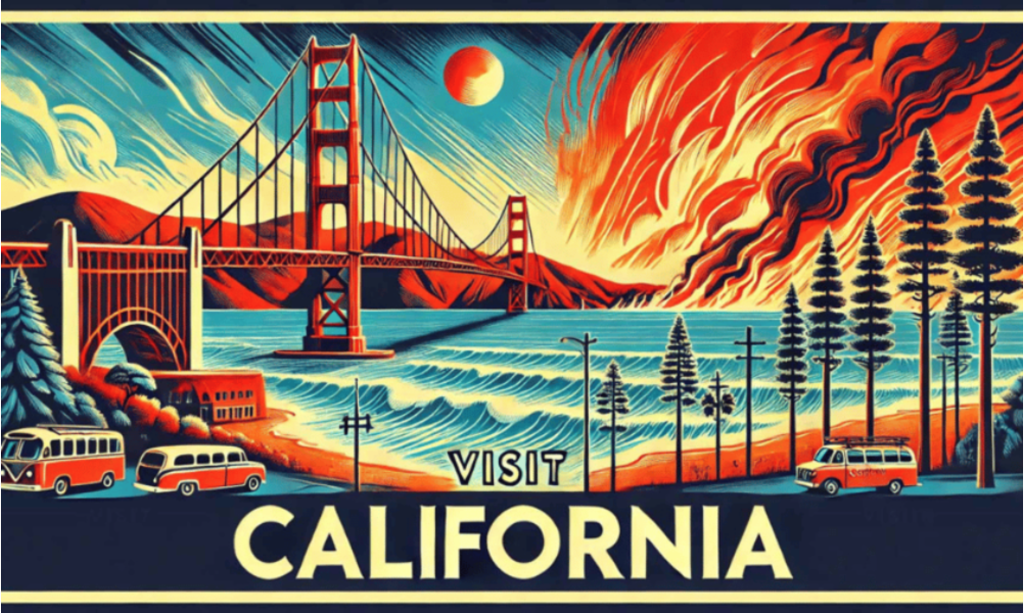 The contest between tranquility and chaos in Southern California maps onto the balance of risk and insurance. The veteran Los Angeles columnist detected the dissonance of a promise of peace and landscape of violence. The area’s attraction was underwritten to mask the risks of facing fires even as flames consumed 44,000 acres in Paradise Cove in 1982, over 11,000 acres in 1985, and, by 1993, the “Old Topanga Fire” grew over seven days across 18,000 acres,–covering ten million dollars in losses of public property and over two hundred million in private property damages. California homeowners resettled the region and the Pacific Coast Highway, their fears falsely contained due to the expansion of California Fair Access to Insurance Requirements Plan–FAIR, as laws intended to respond to the inequities of redlining by offering inner city homeowners insurance before historically discriminatory polices in many urban neighborhoods were expanded to “hard to insure fire areas.” Since 2018, FAIR has ballooned to become a major insurer of California properties, becoming a primary insurer of over 400,000 properties, with an astronomic risk exposure of $400 billion, and raising its coverage from $20 million per location to $100 million by, but leaving it unprepared for wildfires across the state as it expanded coverage to areas of wildfire risk by 2024–leading artists to lampoon the old WPA posters used by the National Parks as insurers were compelled to offer coverage for high-risk fire zones, and their exposure approached $350 billion.