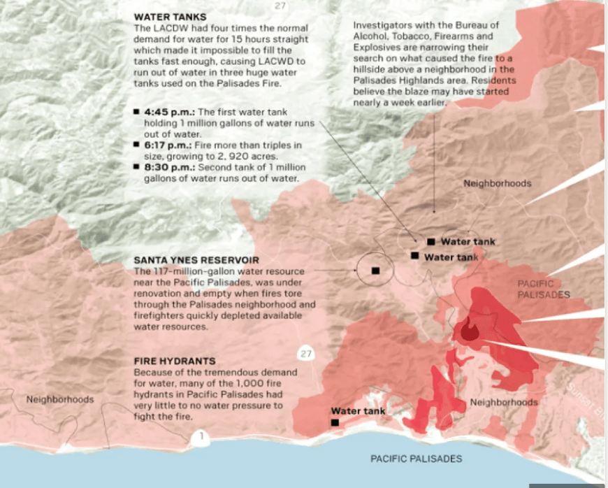 Under the pressure of high winds and with arid ground conditions allowing the fire to speed through combustible brush on the Palisades hills, the other hundred-gallon tank was empty, as it happened–a perfect storm for the fire to spread with a lack of adequate infrastructure in months that were believed to be outside the critical danger zone of fire season usually imagined over by November or December in most normal years. The nucleus of the fire that exhausted the tanks allowed to burn, the fire continued as a thousand fire hydrants across the neighborhood lost water pressure, stripping fire fighters with their basic tool to try to combat its spread, as high winds fanned the flames toward Malibu, and then into the hills where no reservoirs were to be found.
