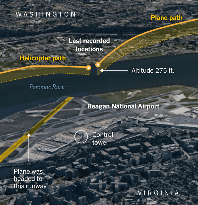 The difficulty lay in the relation between man, environment, and machine, but that is not saying much. The helicopter’s request for “visual separation” to decouple from air traffic meant that they were decoupled from air traffic, and less dependent on radar, reliant on their own eyesight in an are of enhanced light pollution, multiple landing aircraft that were hard to identify, without radar-based calculations of other planes’ position. The airpower allowed them the flexibility around airports, assuming they enjoyed good visibility; but it is likely that bad readings on a faulty altimeter and garbled warnings from tower controllers prevented advance warnings about the circling aircraft, as they flow to over three hundred feet–a hundred feet over the route’s ceiling altitude–hitting the plane at 278 feet if it had been as high as 400–and if they claimed they had the jet in sight, they were hampered by little guidance save direct observation, failing to to receive guidance from controllers along standard flight paths as they strayed above the allowed height. And if there were more than a few recent near-misses at Washington’s Reagan International, the eventuality of a collision seems to have been waiting to happen, even as the routes of planes was reliant on flight measurement, and often left helicopters manning compromised instruments while allowing the helicopter to fly close to the plane by “visual separation” to rely on coordinating their exact positions in relation to one another in a very crowded night sky.