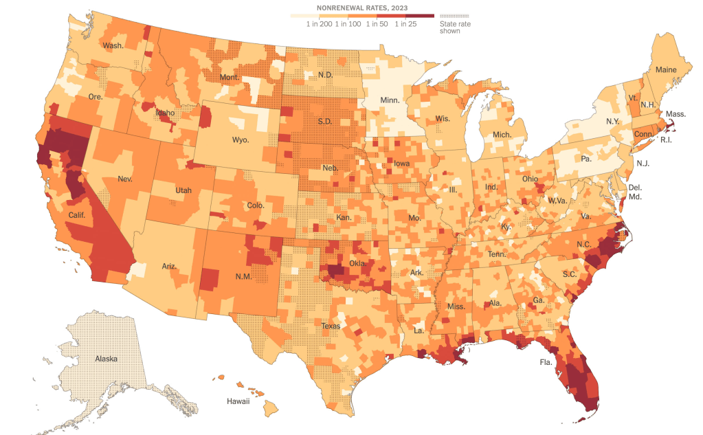 In the wake of recent wildfires, the absence of preparation or local water supplies led to panic, as if they had not read Davis’ The Ecology of Fear. The disaster drastically depleted insurers’ capital, compelling insurers to claim an urgency greater than in their hundred-year history of serving California homeowners–“risk is greater in California.” in hopes to secure the 2.8 million policies already issued in the state, even if it has ceased issuing policies and not renewed some 30,000–as home insurance contracts, in relatively shocking manner, have been unceremoniously “dropped” in much of the nation in the face of heightened unprecedented climate risk and “non-renewal” rates in much of California had grown in landscapes that were already identified as of high fire risk.
