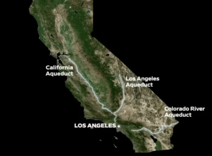Every time it is a perfect storm, if the storms keep happening, and fire seasons expand beyond seasons, and not only due to rainfall. We have not created reserves for water capture, on the ground and for local needs. For in allowing hydrants to run dry as flames spread in multiple fires across the combustible landscape of the hills fed by the Santa Ana winds. It was a landscape that was desiccated due to an absence of rainfall, but not because of a chokehold on water supply from the Central Valley or north, and the opening up of those massive “valves”–as much as valves are automatically activated in an individual building’s or hotel’s fire system, the logic by which Trump has extolled the “valves” of an imaginary waterway linking California and Canada,–as if the needed flow of water had been shut off at the border. In the image of a state where water flowed in massive aqueducts, the project seemed one industrial engineering got wrong, where opening and overriding of federal laws protecting endangered species and environmental laws could save the state, to allow a hyperbolic “hundreds of millions of gallons of water [to] flow down into Southern California” as if they had won the jackpot or lottery in his Presidency after being deprived by the bureaucrats and nonprofits in Sacramento.