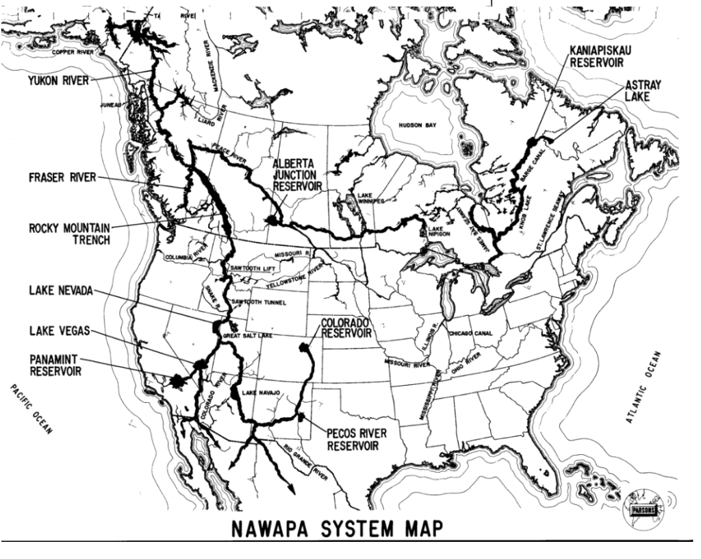 NAWAPA System Map as Imagined by Ralph Parsons (1965)