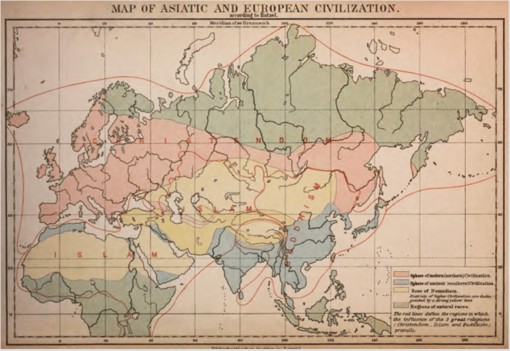 While Ratzel was, of course, thinking a bit about the ways the linguistic origins of place and law in a global context. The unsung evil twin of Prussian legal theorist jurist Carl Schmitt, whose political theology justified the Nazi regime’s ideology, Ratzel was the step-father of its political geography; his “organic state theory” offered a lens to justify the territorial organization of states, in rational manners, if, unlike Schmitt, his travels to the United States helped to develop his ideas of man and environment in the United States’ western states, and a meta-geography cast the boundaries of the United States in what Carl Sauer has called the “cultural hearths”–but developed his notions of divides of European and Asia Civilizations from his time in North America. Lebensraum was tied for Ratzel to the geomorphological notion of race, born in the United States, of all places, where the great “telluric force” offers a planetary law–a globalist thinking, indeed, that led him to adopt many notions of racial classification and difference that were developed in the United States, as James Q. Whitman so convincingly recently shown. But if the migration of American notions of racism to the multi-ethnic populations of central Europe is increasingly appreciated, the reiteration of notions of lebensraum across the Canadian frontier has been preserved in the technocratic image that survived across later generations.