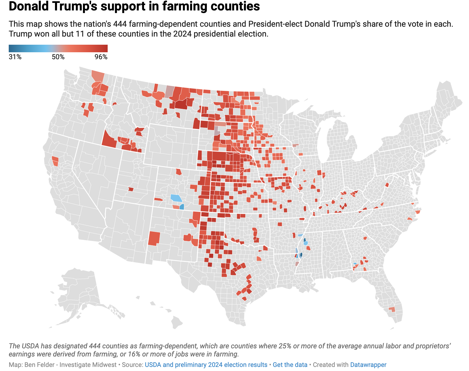 Trump’s Electoral Support in 2024 Election in Farming-Dependent Counties/USDA & 2024 election (Ben Felder) Get the data. Created with Datawrapper