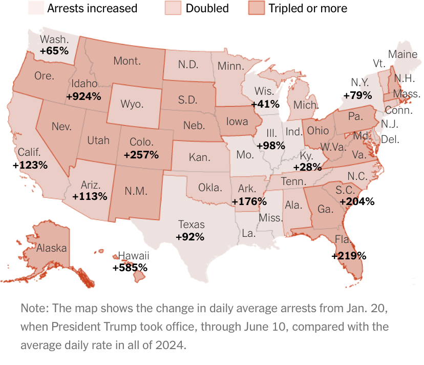 –often displaying intimidatingly significant shows of force by masked men carrying clubs, batons, and firearms. The displays of violence have come to haunt Los Angeles’ streets, stricking fear into immigrant communities not only in Los Angeles, but across the state, lest deportation agents expand their reach into areas many belonged to the civic fabric. Indeed, until a federal judge order barred federal agents from detention stops without “reasonable suspicion” and prevented warrantless raids, arrests and detentions escalated in raids on workplaces in the month of June seemed to continue under the pretext that the city had been invaded, and demanded a military show of force to “restore” justice by attempting to deport or detain a hundred people a day.