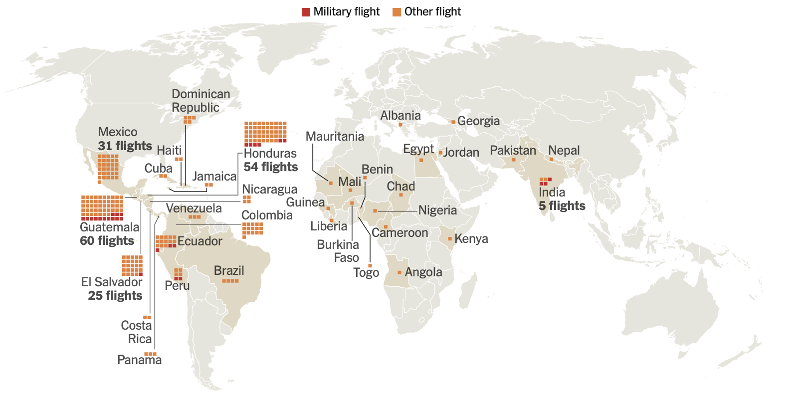 Deportations by Military Flights in First three Months of Trump’s Second Term/NY Times. Deportations on Commercial Airlines not Shown
