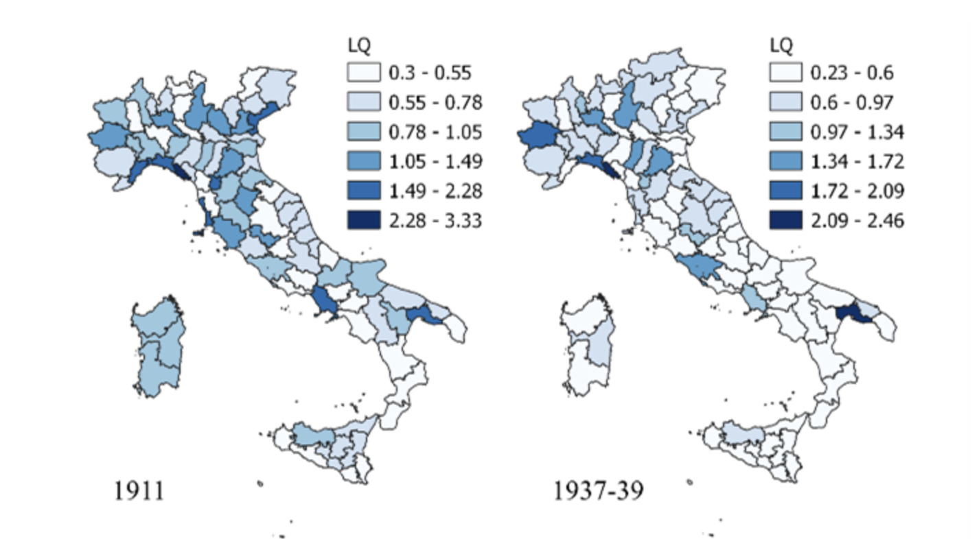 Location Quotients of Industrial Manufactures in Early Twentieth Century Italy