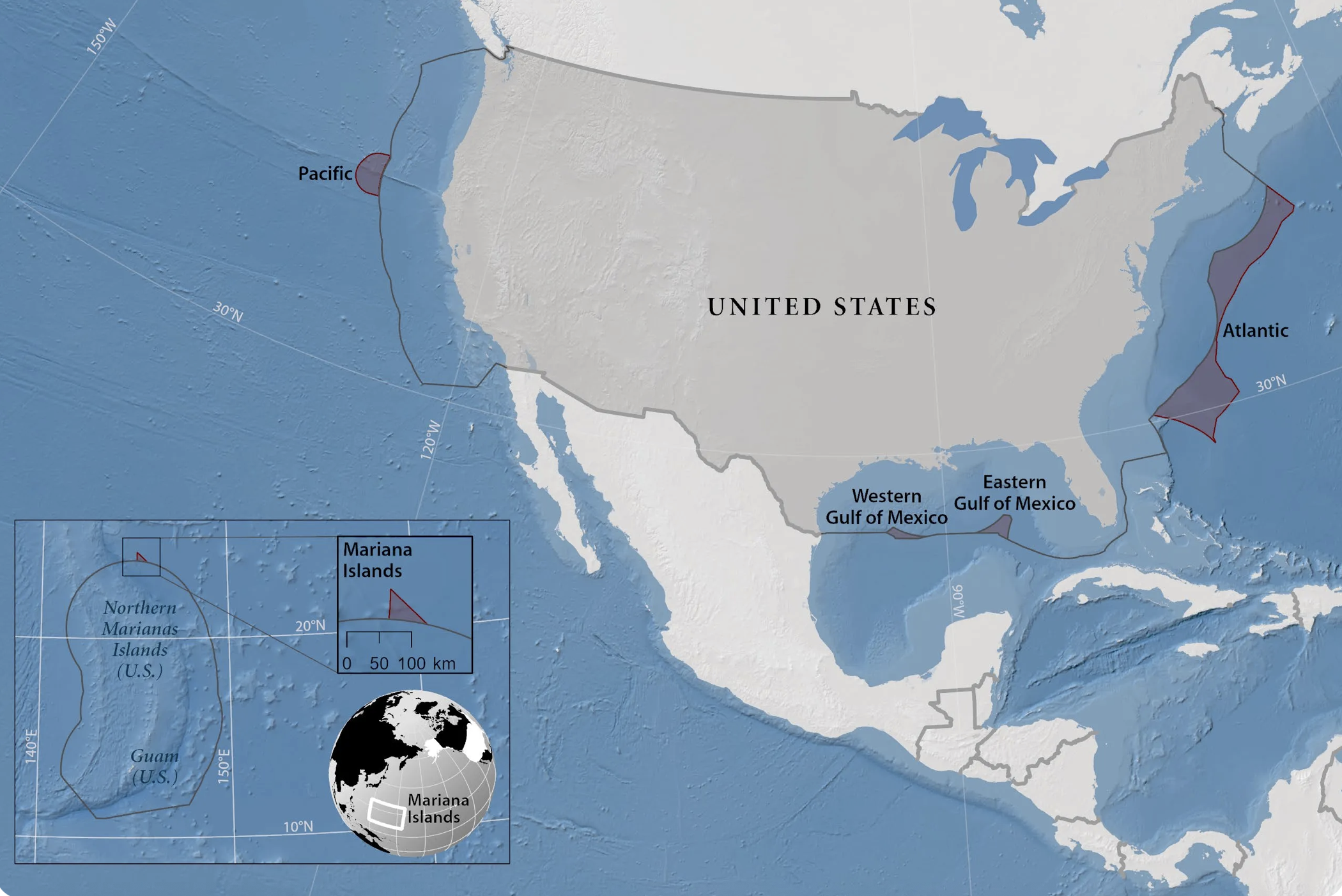 The unilateral claim to redraw boundaries as “final and binding” was an effort begun by onetime Texas oilman George W. Bush, who floated the exploratory project in response to rising fuel prices and “national concern about the rising cost of gasoline” back in 2008, shifting the Outer Continental Self to new areas with an deep and steady eye toward future robust energy extraction. If it must have attracted oil companies, it set a precedent for the expansive claims with which Trump seems to remap sovereignty by fixed bounds. By expanding sovereignty to two hundred nautical miles from the coasts, the safety regulations of earlier administrations and of NOAA might be sidestepped and evaded, opening up management of areas untapped by industry, and less at danger of spoiling or polluting maritime coastal lands, by defining the sovereign rights to over three million km of ocean floor, larger than Alaska, Texas, and California combined, to use three states that have been historically associated with oil speculation, and collect data on the sediment thickness of the long hidden seafloor topography of particular interest to oil and gas companies.