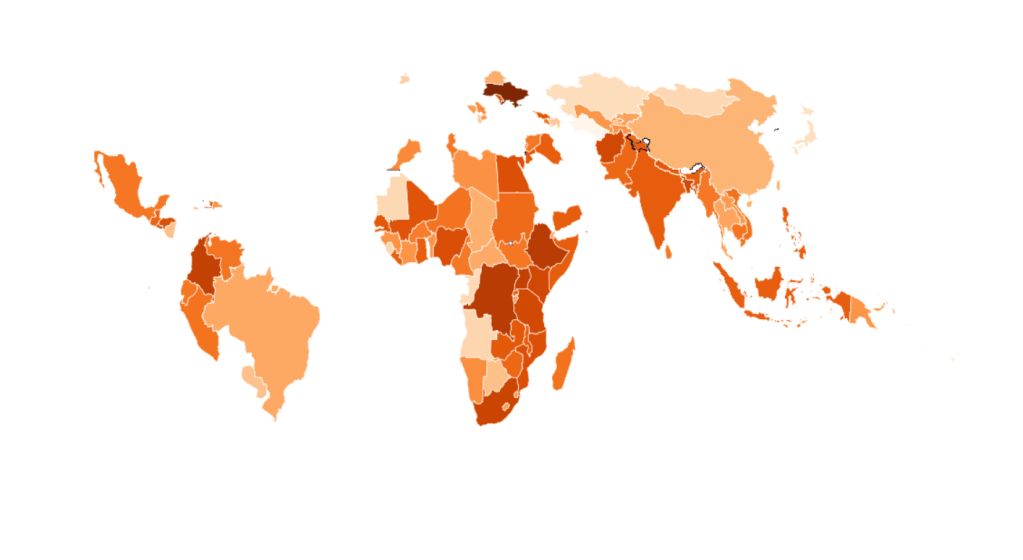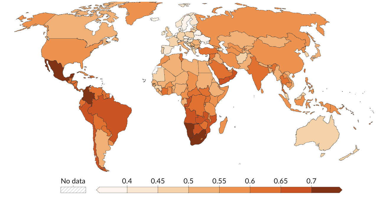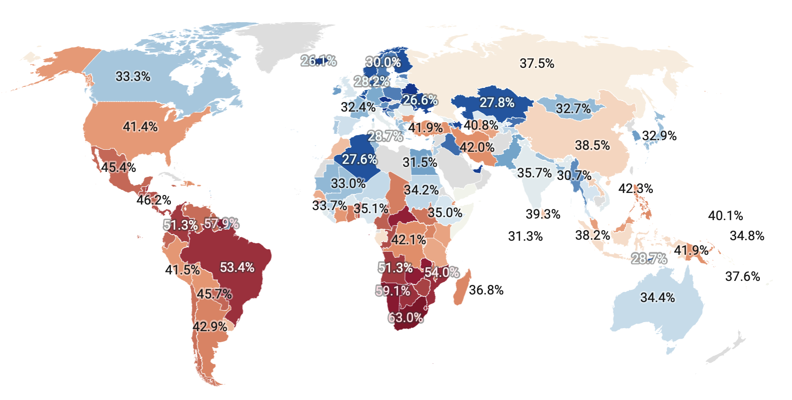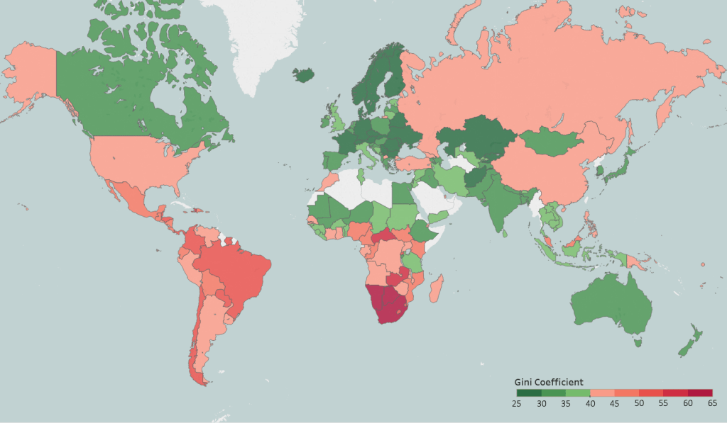 Gini was fearful of communists’ ties to the Soviet Union, the supra-constitutional nature of sovereignty that Donald Trump indulged in his second term is an attempt to preserve and prop up American entitlement in an age of globalization, as if fixing in stone the global economic imbalances that Gini Index measures,–an imbalance evident in the blunt color ramp of this updated Mercator map of global economic reality of ever-deepening red, or crimson, to denote the greatest levels of wealth inequality in 2019–
