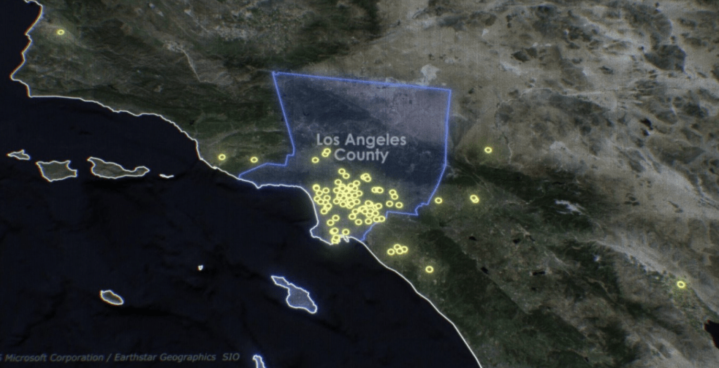 If this is national security, however, the role of boosting investment in the defense of the border wall is a project of national defense that will be designed to expand the national debt by beyond $5.4 trillion, as its tax cuts are made permanent, a massive give-away to industries of defense and the increased data surveillance operations demanded to make the nation safe. Indeed, the showcasing of Los Angeles as a city that is “invaded territory” and demands personal deployment of military forces–members of the National Guard, U.S. Army and the U.S. Marines–to ferret out the undocumented by new tools of geolocation and databanks has created a map of detentions and deportation that has come to haunt not only immigrant communities across the nation, but to set new standards of justice, or of the lack of civil rights and ability to redress the plainclothes agents of DHS and CPB that have massed around the city’s malls, department stores, parking lots, car washes and fabric shops. The city is a poster-child for the power to deport undocumented living in America, many born in the United States, for the crime of border-crossing between June 6 and June 2, 2025 from Pasadena to Long Beach, and even far beyond LA County in Fontana or Oxnard–