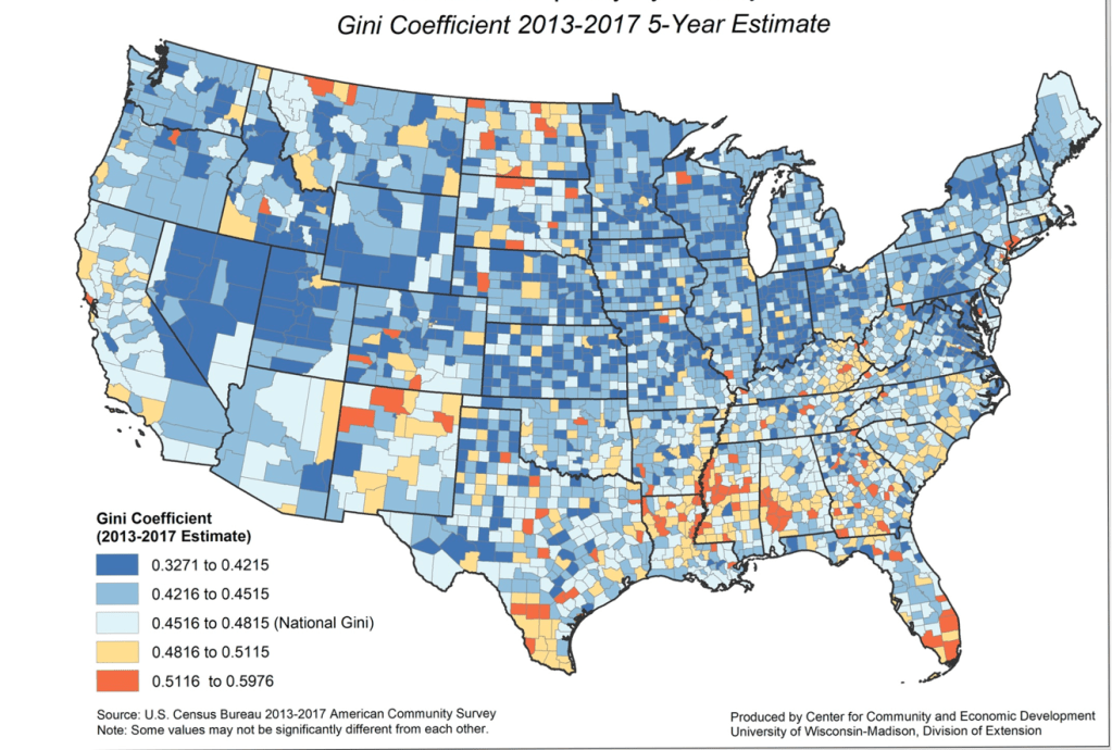 as a more dated visualization crafted not in ways that might try to map onto the electoral college, but produced by friendly folks at UW Madison’s Center for Community and Economic Development who are less obsessed with states, and are trying to talk about economics at a local level, in hopes to help their readers get a closer feel for how things are on the ground, as much as in relation to the political slant of their communities. While the below map might be a good place to start to think about gerrymandering, a current concern, and the five year estimate is dated, it maps onto the election of Donald Trump with some surprising interest, and onto the emergence of “the border” as as a surrogate for national security and a political football Democrats have never been able to hold. The border communities are where the income inequality was highest, and where the fears of migrants stealing jobs and undercutting wages were most important, landing some needed electoral votes in New Mexico, Texas, Oklahoma, Arkansas, Louisiana, and Florida, and introducing a sense the global economy as something that the United States is unable to control and a victim.