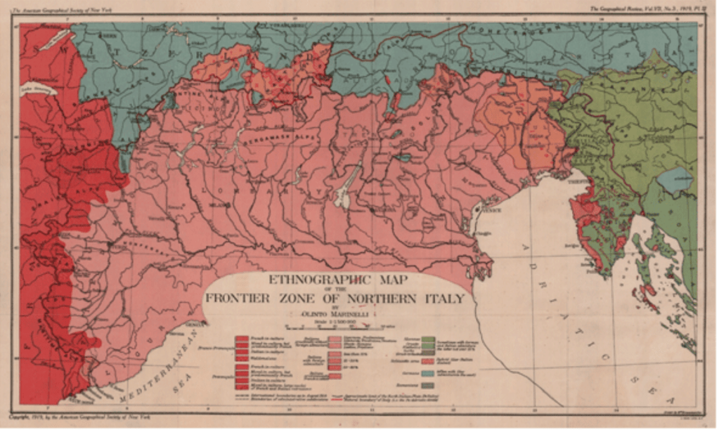 The concept of Lebensraum in Italy has of course been known as the control of a new national space, even if it included many who were not Italian-speaking, a reclaiming expanded national space that has been known as rridentism, and the claiming of e terre irredente as a nationalist platform in the late nineteenth century that th work of geographer helped embody. The “border” was a “frontier zone” but could be ethnologically and linguistically mapped, as fuzzy as the actual borders between Austria, Croatia, or the future Yugoslavia, and France might be: the geomorphological nature of the frontier proved that geography was the child of geology–or “Geography the Geology of the present,” as the geographer Marinelli–who had left the Austro-Hungarian Empire for the new nation of Italy in 1866 declared with startling certainty in 1879, as if to clarify the division of the Alpine border in empirically verifiable terms in organic terms, giving the Kingdom of Italy a sense of rigorous bio-political integrity that it had historically long lacked. The maps devised by geographers gave concrete reality in a four color map to the Italian lands, transforming the border zone nourished by a large riverine network in new projects that quantified Italy’s newfound national space, measuring and mapping “regioni integrali” as both physical and biological concepts of political geography–as if this were not about politics but objectively recognized and acknowledge as areas of economic value in need of being securely policed by geopolitical borders–maps that were brought to the Paris Peace Conference after First World War I and impressed the Great Powers as a basis to determine the state’s new political frontier, long before fascism hoped to proclaim a far further expansion of the borders of the nation across the Mediterranean.