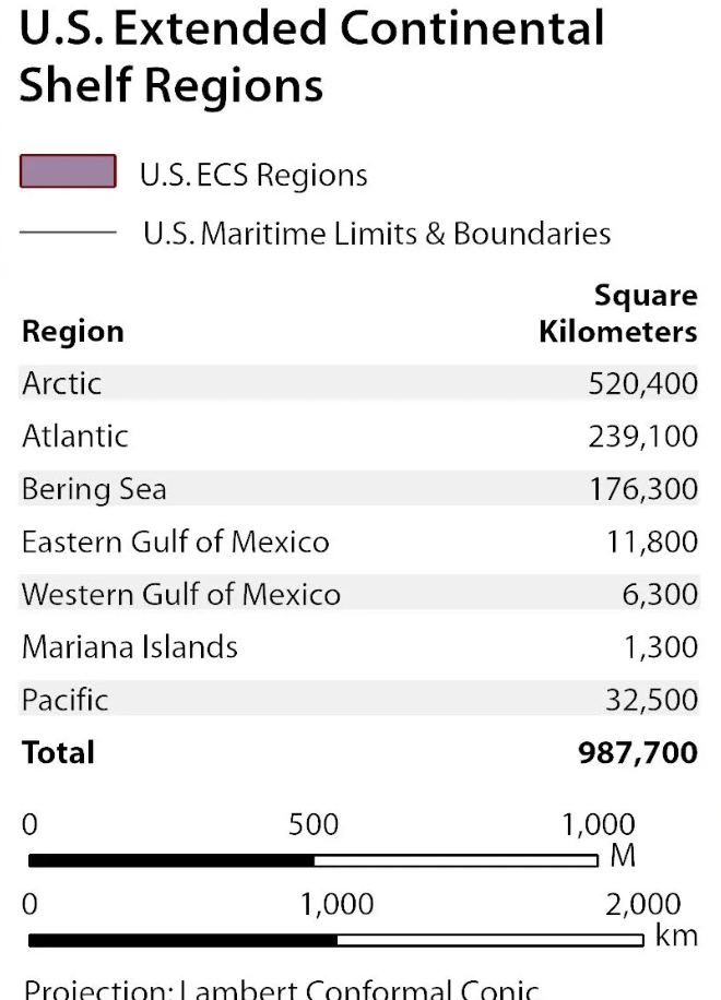 The foundation of the Expanded Continental Shelf Project in 2014 only occurred in the Obama era, defined by a logic of protecting and advancing American interests over oil, natural gas and minerals–including the Arctic Ocean–the largest area of the United States’ Expanded Continental Shelf–by drawing new lines of state sovereignty in a bid to “delineate the outer limits of the US continental shelf in accordance with international law as reflected in [UNCLOS]” in 2022 as part of the National Strategy for the Arctic Region–even when those boundaries overlap with the lands claimed by Canada, The Bahamas, and Japan, where questions of sovereignty are apparently asserted for future negotiation. It seemed like a good idea, a remapping of national borders to national advantage, even if it was a gesture of supremacy that ran against the United Nations’ Law of the Sea, and did so to the benefit of drilling for offshore gas and oil.