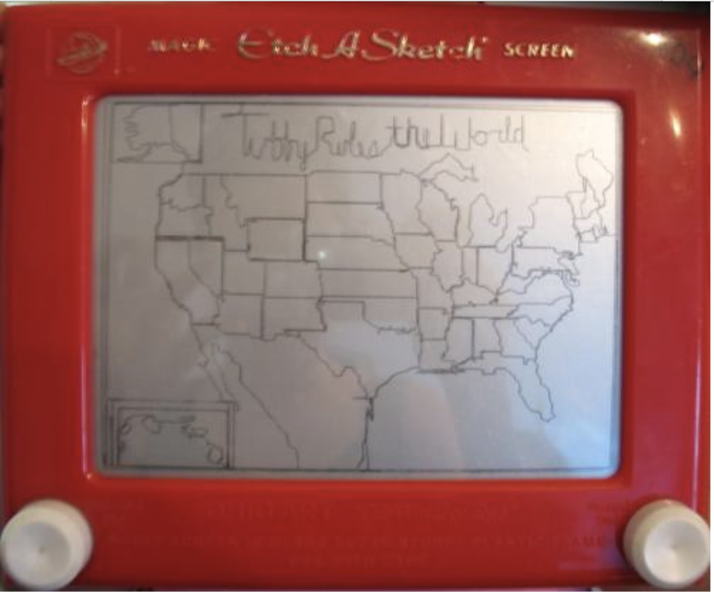 Even after Musk’s public rift with President Trump, his grandfather’s hourly map of a future hemispheric dominance promotes a robust economic unity of defensible borders in a persuasive image whose logic of Trump’s ability to remap globalization. For if the map was designed as an isolationist screed in an early era of global mapping, it seems today to give license to mapping geopolitics on a dry erase board or Etch-A-Sketch, able to push to extremes how Trump 1.0 was cast as an Etch-A-Sketch presidency. The Etch-A-Sketch board designed by André Cassagnes gained such attraction as an American Toy in the Cold War after it was sold to the Ohio Art Company, the plastic red frame that encased a gray screen seemed an image of autonomy by which kids, maybe including a young Donald Trump, delighted as a way to focus their attention on an easy redesign of their visual field: the emulation of the television screen suggested a palette of design sold as a way to expand the creative potential of Americans was a uniquely clean ways with no mess,–in short, a tool promising utter absorption for hours for children, in long car rides, a sort of iPad before the iPad designed for intellectually nourishing low-cost babysitting, offered on television before the notion of a growth mindset to parents looking for the perfect Christmas gifts. Did Trump get one for Cas a child, offering hours of ways to whittle away the hours to magnify his early sense of self-empowerment?