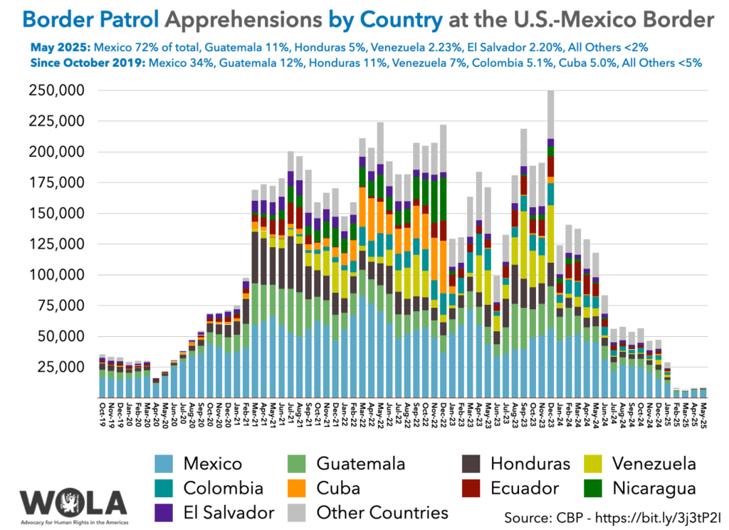 The bar graph suggested a stream of illegal migration that the fools in Washington, DC had so irresponsible tolerated and allowed, independent from a map. It is a distortion of government in the geostrategic hemispheric problem of monitoring mass migration, demanding to be placed beside by the more informative bar chart of Border Patrol Apprehensions at the US-Mexico Border, from 2019 to May, 2025, parsed by the actual origins of transnational migrants, mapping the problem of one border in a more hemispheric context that Trump rather willfully ignored.