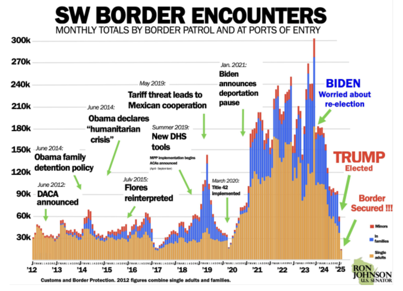 The bar graph suggested a stream of illegal migration that the fools in Washington, DC had so irresponsible tolerated and allowed, independent from a map. It is a distortion of government in the geostrategic hemispheric problem of monitoring mass migration, demanding to be placed beside by the more informative bar chart of Border Patrol Apprehensions at the US-Mexico Border, from 2019 to May, 2025, parsed by the actual origins of transnational migrants, mapping the problem of one border in a more hemispheric context that Trump rather willfully ignored.