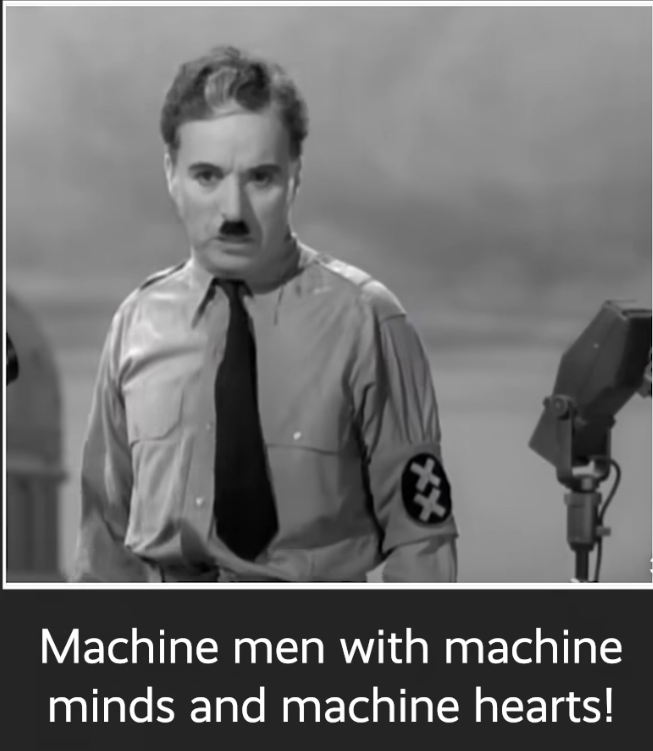 Rather than the insular notion of the nation, the Technate promised a new mapping of nation-state as an economic entity by rational lines of energy production and consumption, fit for globalization, a sturdy island in the currents of global financial markets, an anti-map of a globalized world. The image of a rationally designed state was decried, of course, famously, in the United States, when the first speaking film of Charlie Chaplin, born but within four days of Adolf Hitler, in 1940 decried the paradox that for all its promises, “machinery which has promised us abundance has left us with want,” casting the costs of government of machine-men for humanity as huge, eerily contemporary to the Technate of America. For in decrying the danger of rule by “machine-men with machine minds and machine hearts” who create and benefit from national borders and fixed frontiers, the character Chaplin played took his own voice, held in technological check in earlier films, to pose before a microphone to broadcast his indignation at the division of national boundaries as barriers.