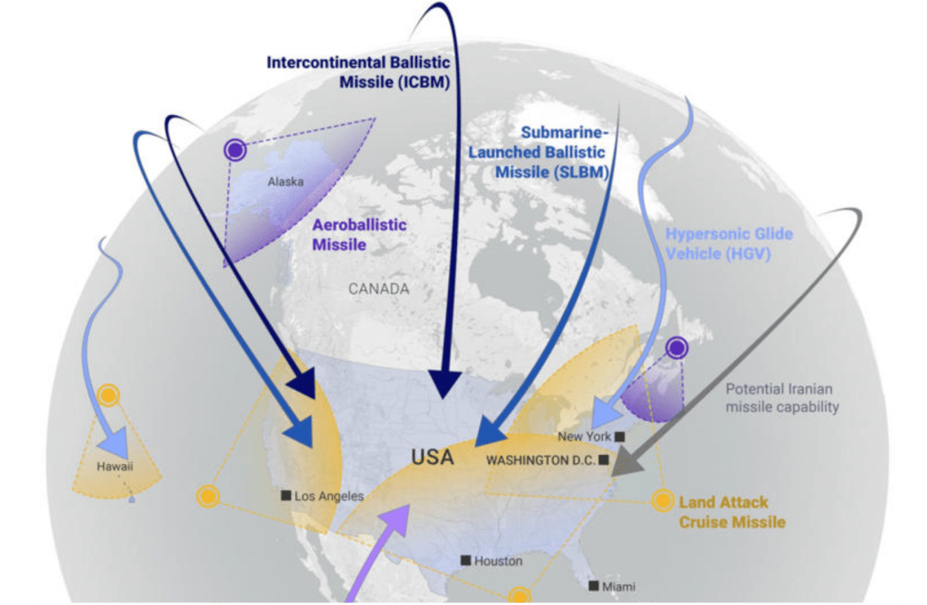 And even while emptying out social services, making people feel so bad and insecure he may expect us glad to swap out health coverage for military coverage, the “Gold Dome” seems to herald a new era of coverage against imagined threats of the Cold War era, over a geographic region so broad to warrant the $61B he hopes to extort from Canada to cover the downpayment, and maybe include Greenland as well–by changing its presence in Northern Command, instead of European Command, as if in premonition of a new war. The weird wakeup call to the European Union and Denmark remaps the nation in the future defense of the expanded American territory, a slap in the face to the Kingdom of Denmark, but one big step for mankind, by unilaterally mapping the world by prioritizing American defense. While there was no publicly released map of the coverage offered by the Golden Dome–it has not been built beyond the drafting table!–publicity plans expand defensee by ICBMs, hoping to detect and defend missiles by sensors to intercept them in mid-flight–covering Canada and Greenland, as if extending an invitation to integrate sovereignty in a security umbrella in the face of global peril. The demand for broad range anti-missile detection–“other places have it, and the United States should have one, too!”–is born of entitlement, and of a sense of keeping up with the Joneses, demanding command and control mechanisms many engineers find unrealistic; draft images suggest wishful thinking outstripping contingencies or practicalities, as if targeting the US by Russian and Chinese missiles allowed a Cold War geography of isolationist panic to be unearthed from the graveyard of history and terror of a Cold War–that truly seemed dimensioned for a mass-market a sci fi paperback’s cover, as much as a project of America’s Department of Defense.