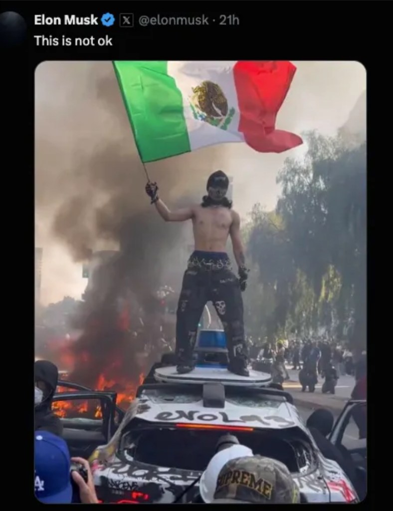 The disaster nationalism may bode the end of American government, if not a dark spell, as the end of oversight bodes an untold level of corruption, more akin to the “outer boroughs” of Mafia dons than politics as usual. The fears of rabid mobs attacking American cities, waving Mexican flags and leaving store windows shattered and self-driving cars burned as they act to destabilize the peace seems to have brought a dizzying degree of disaster nationalism to the official feeds of the American government not even six moths after Trump’s inauguration. Is it any surprise that the Waymo, or self-driving cars, became a surrogate of disgust at Elon Musk’s corporation, if not for Teslas, a frequent source of vandalism in recent months. Did the violence wrecked on the self-driving cars link data-collection services to Homeland Security digital dragnets of deportation of so-called “illegal” immigrants, even after Musk has officially “departed” government? Bonfires of the highly combustible LiIon battery packs, that combust to burn faster and hotter than gasoline, seemed the perfect medium to destroy the cameras perched on the cars to grab up digital data, a means to resist the very data-driven mechanism of deportation sweeps Trump campaigned on, that 2,000 federalized National Guardsmen the President rallied for the occasion seemed ready to enact? For the disembodied vision systems by which they scan their surroundings three hundred and sixty degrees embody the surveillance systems embody that the protestors seek to resist.