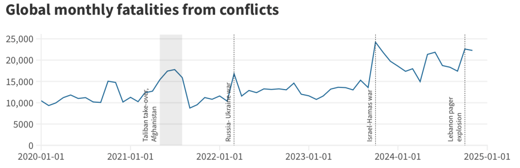The ecstatic jump was a reverie, perhaps, but was the clearest sign of Musk’s open embrace of the expansive nature of American sovereignty that Musk s is not just rebranding. It is a new messaging of sovereignty and belonging, rooted in a priority of American exceptionalism that, even as it denies isolationism, embraces an increasingly isolated global future. But while President Trump’s second inaugural seemed to avoid offering any map of the world as he unrolled triumphal plans for an American future that suggested not only “westward the course of Empire takes its way” but to outer space, and indeed to Mars. The spectacle it promises to blind us to wars Ukraine to the Middle East to Myanmar. Indeed, Americans’ deep inability to process the new scale of global conflicts of what seemed a third World War outside familiar theaters of global conflict,–whose terrifying monthly tally of fatalities grows beyond 20,000 deaths per month–a surge of fatalities of unimagined trauma. Few Americans are counted among the dead in these wars–no American deaths!–but a jump of deaths by a third is hard to get one’s head around, and rather shockingly almost absent from the recent Presidential election, waged largely on domestic politics, save Trump’s grandiloquent empty promise to end conflict in the Middle East and Ukraine on day one.