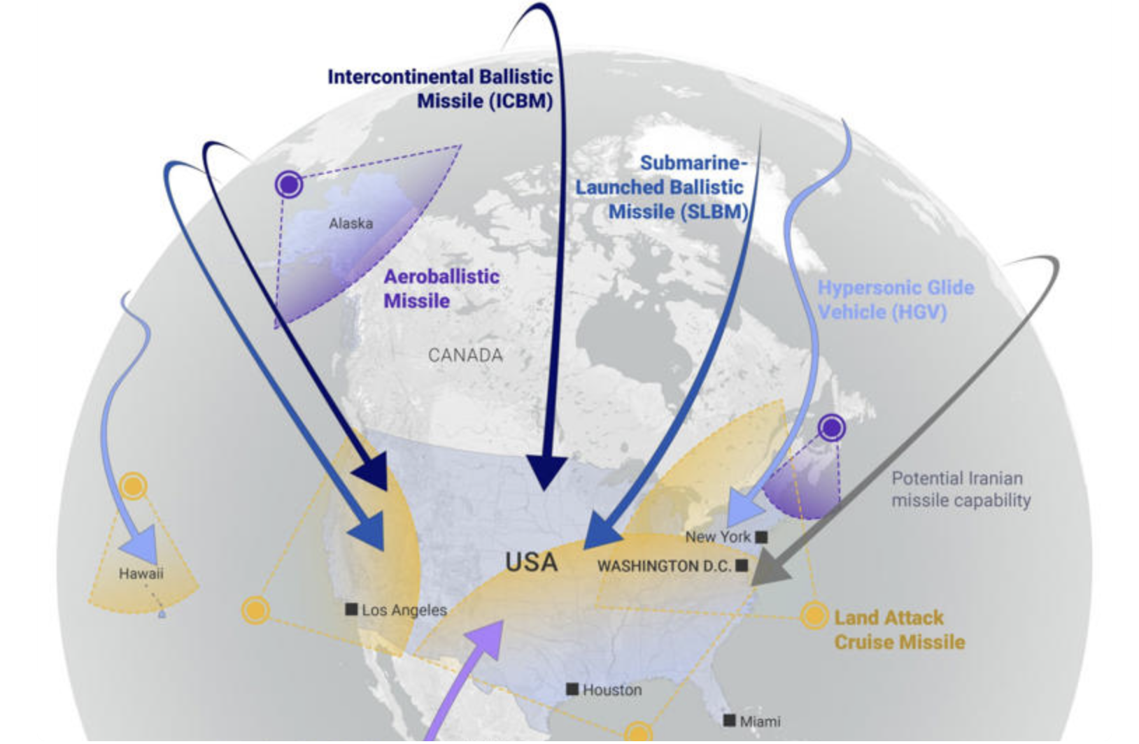 And even while emptying out social services, making people feel so bad and insecure he may expect us glad to swap out health coverage for military coverage, the “Gold Dome” seems to herald a new era of coverage against imagined threats of the Cold War era, over a geographic region so broad to warrant the $61B he hopes to extort from Canada to cover the downpayment, and maybe include Greenland as well–by changing its presence in Northern Command, instead of European Command, as if in premonition of a new war. The weird wakeup call to the European Union and Denmark remaps the nation in the future defense of the expanded American territory, a slap in the face to the Kingdom of Denmark, but one big step for mankind, by unilaterally mapping the world by prioritizing American defense. While there was no publicly released map of the coverage offered by the Golden Dome–it has not been built beyond the drafting table!–publicity plans expand defensee by ICBMs, hoping to detect and defend missiles by sensors to intercept them in mid-flight–covering Canada and Greenland, as if extending an invitation to integrate sovereignty in a security umbrella in the face of global peril. The demand for broad range anti-missile detection–“other places have it, and the United States should have one, too!”–is born of entitlement, and of a sense of keeping up with the Joneses, demanding command and control mechanisms many engineers find unrealistic; draft images suggest wishful thinking outstripping contingencies or practicalities, as if targeting the US by Russian and Chinese missiles allowed a Cold War geography of isolationist panic to be unearthed from the graveyard of history and terror of a Cold War–that truly seemed dimensioned for a mass-market a sci fi paperback’s cover, as much as a project of America’s Department of Defense.