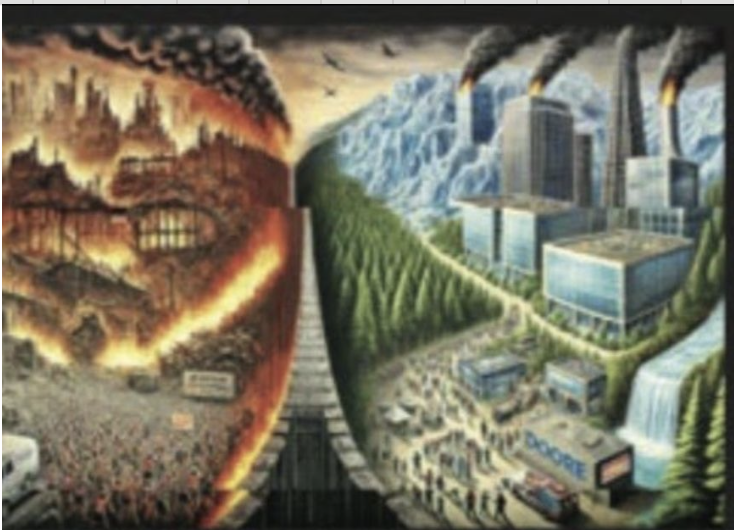 For when heavy winds whipped up the flames believed to be extinguished on January 7, just in time for Trump’s inauguration, the embers of the Lachman Fire he lit bounced back to create the apocalyptic scenes he had asked GPT to imagine, if the truly dark clouds from which all those imagined people flee, running past what seems an emergency vehicle, seem walled off in a dystopia land of Rinderknecht’s earlier creation, walled off from the utopic image of the city whose residents seem to go about their business at a safe remove from the growing conflagration. The billowing smoke that blanketed forested lands’ skies in the generated image below were perhaps so triggering to compel OpenAI to issue a public statement, disclaiming any culpability for providing these “pictures” of apocalyptic reality that seemed to envision the disaster of the Palisades Fires in almost biblical terms as the end of an empire. The OpenAI team was making sure everyone knew it was absolved of responsibility, for providing that image months before the fire began in a “dystopian painting showing in part a burning forest” as residents flee the specter of spreading flames, desperately doing their best to escape death and destruction by “running away from the fire.”