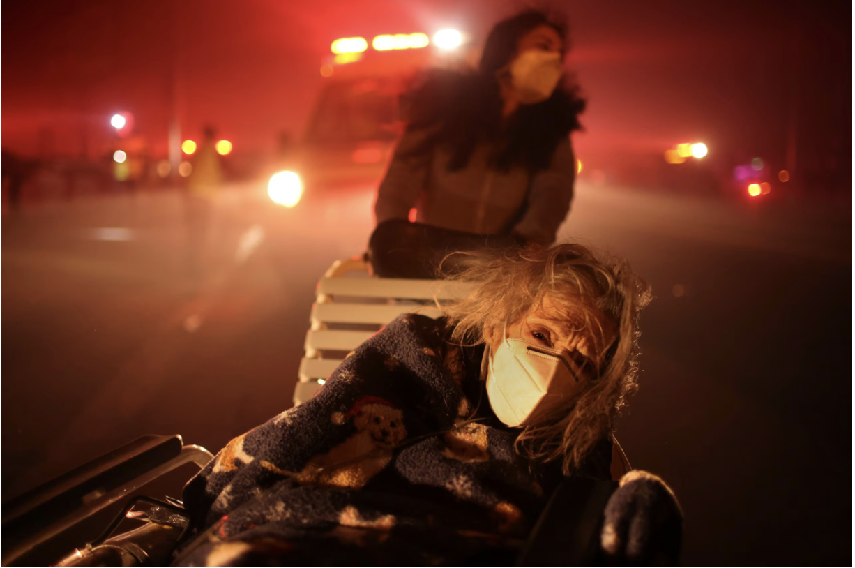 The burn area on the edges of the city became impossible for firefighters to extinguish as it consumed the load of dried vegetation under hurricane-force winds, exceeding local reservoirs of water and providing a searing image of the inability of humans to control natural forces in their immediate surroundings–spreading faster and across a burn area far greater than previous fires.