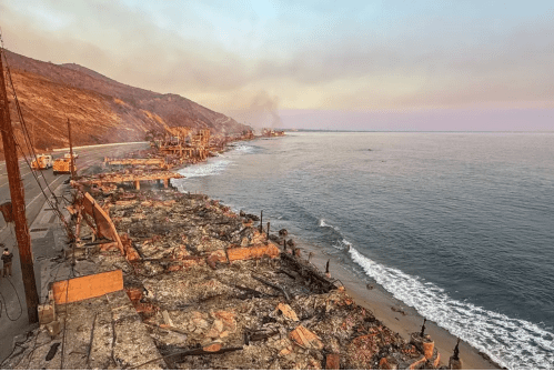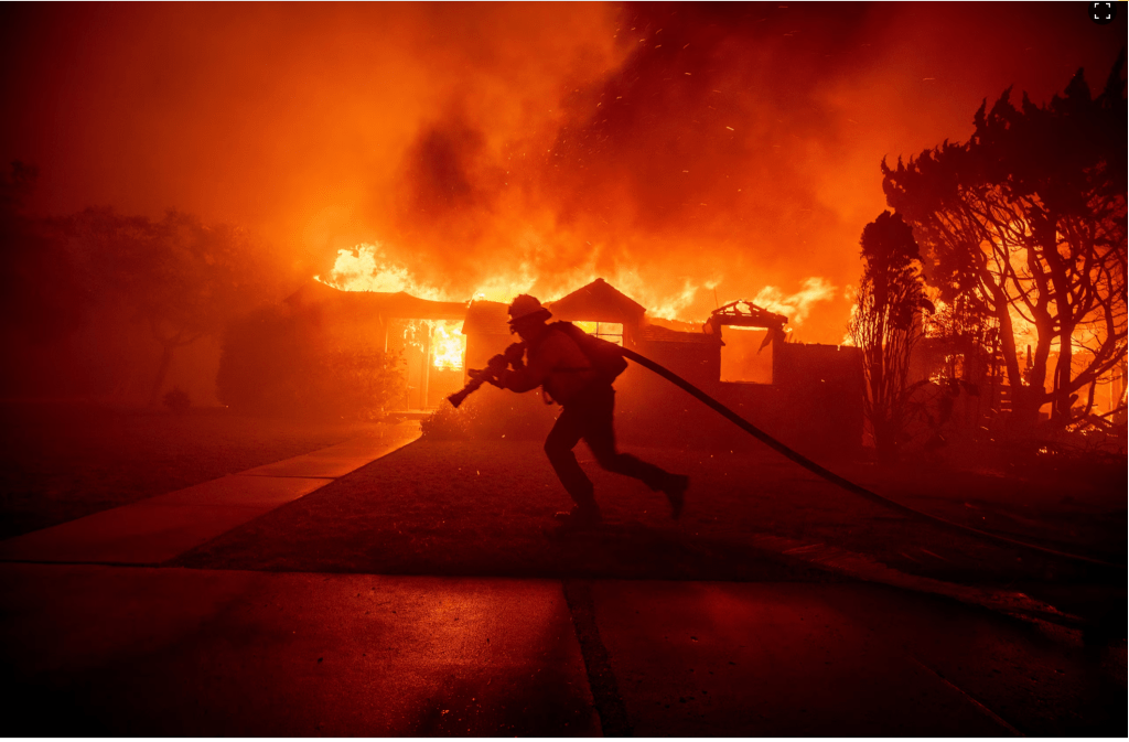 In a dreaded constellation of factors that set new standards for multifactorial explanations–as climate change will–but might be confused by being tied to divine whim, or ill fate, the Los Angeles fires of early 2025 were fanned by otherworldly hurricane-force winds that created fireballs that firefighters struggled to extinguish against all odds. The hurricane-strength winds that fanned the spread of the fire consumed mansions of the Pacific Palisades, a coastal enclave of the wealthy, suddenly more vulnerable to flames. Those less fortunate residents of Altadena, CA were not leaving cars, but fleeing on foot amidst emergency services, masks on mouths in hopes to prevent inhaling toxic smoke, desperately navigating safety beneath skies glowing an eery red seemed an image of hell in the poorer community–where flames reduced homes to skeletal structures–trying to flee to safety from the Eaton fires in nearby communities, where many residences were destroyed and traffic jams created on the interstate that led many to abandon their cars–not the easiest habit for Southern California residents–