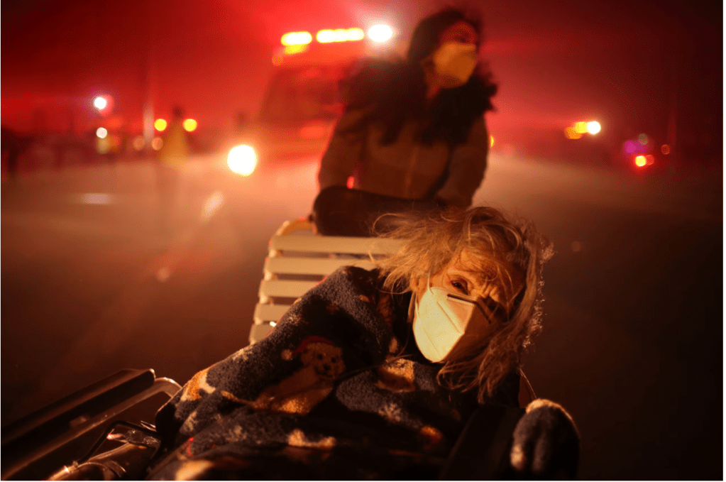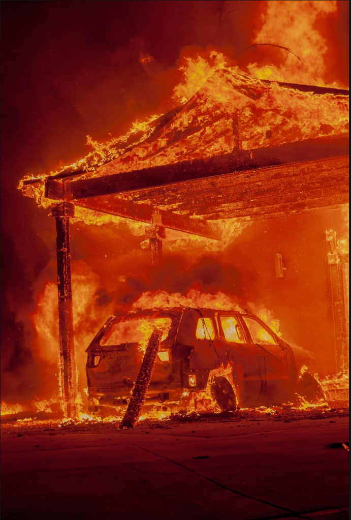 The burn area on the edges of the city became impossible for firefighters to extinguish as it consumed the load of dried vegetation under hurricane-force winds, exceeding local reservoirs of water and providing a searing image of the inability of humans to control natural forces in their immediate surroundings–spreading faster and across a burn area far greater than previous fires.