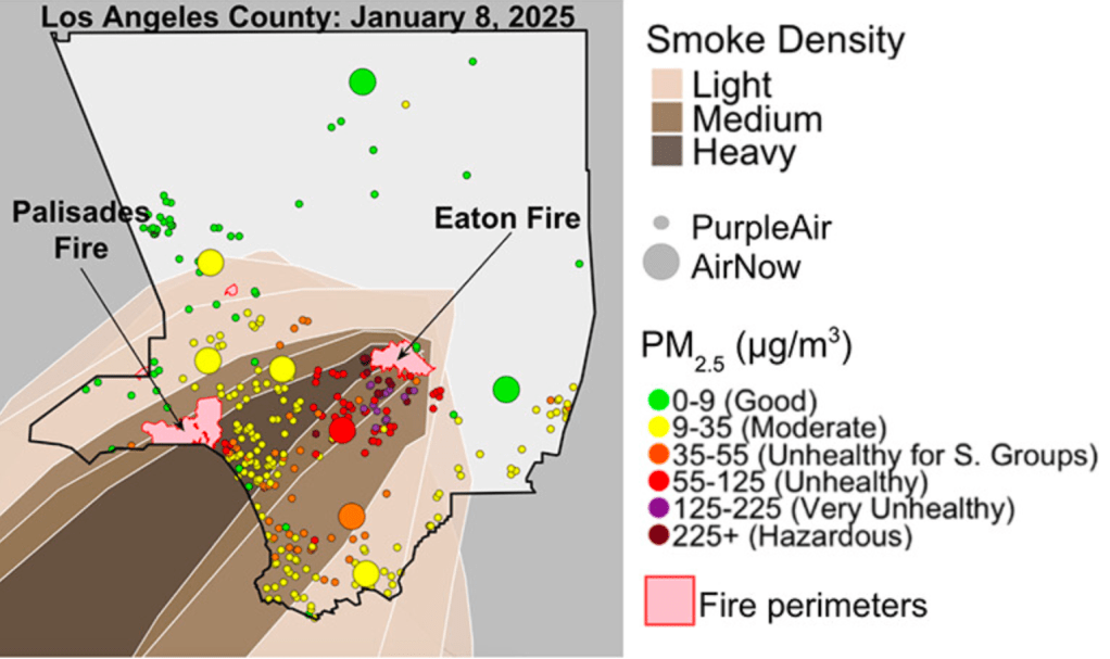 The accusation of premeditation seems evident from the apocalyptic images of the black plumes blanketed Los Angeles the region’s once blue skies with smoke of dangerously high levels of fine particulate matter (PPM 2.5) from several wildfires that were spreading into the surrounding hills,–prompting warnings from health agencies as the AQI index rose to 400 or 500 near the fires and “hazardous” within five miles of the fires, and “unhealthy” for the entire city–until those high winds blew the dangerously high levels of smoke away within the week, ending school shutdowns and public health warnings that seemed like COVID all over again.