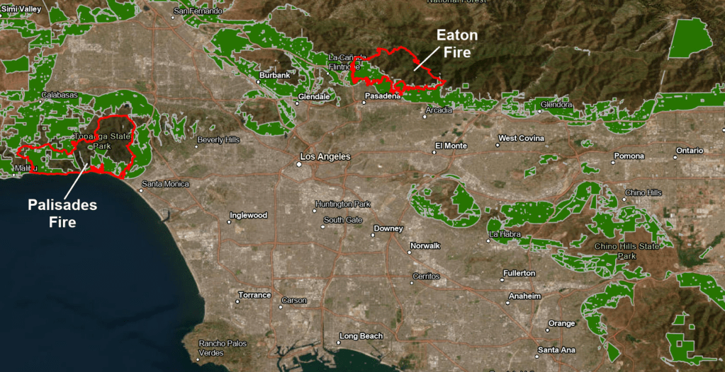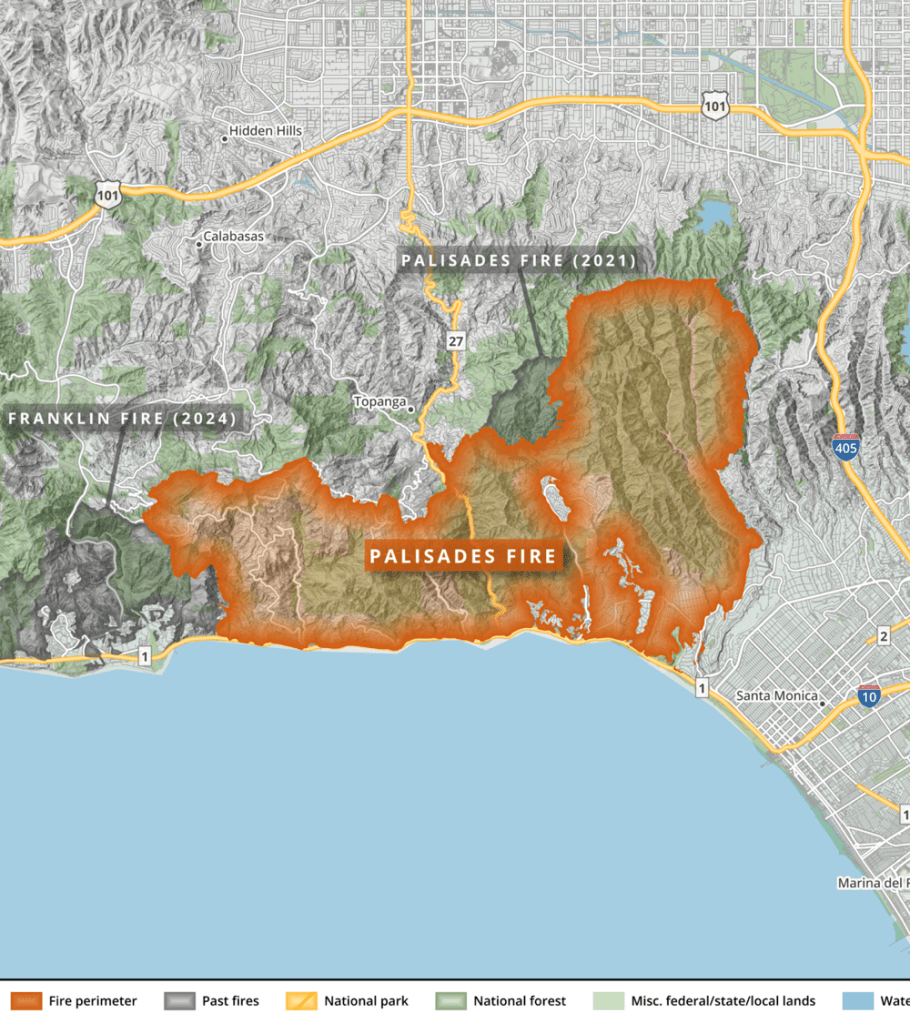 –provoking collective questioning and at least a temporary interrogation of what went wrong. Suddenly, in ways that intersected so eerily with Donald Trump’s inauguration, the built world around Los Angeles, and indeed some architectural treasures of the early twentieth century, were revealed as ephemeral and at risk–not hhugely valuable properties were flattened, but as fires spread across the arid landscape of the Palisades, carried by the embers and sparks that moved in paths we have not clearly traced, the dormant embers of an earlier fire, unextinguished, suddenly rekindled in the forested lands, and rapidly spread in the Santa Monica mountains in the Santa Ana winds to Topanga and Malibu, over 23,000 acres, fanning one of the largest fires in California’s history and largest losses of property and residences the state experienced. Eight months without rainfall created a landscape primed for the destruction of property and forested lands. What followed numerous red flag warnings by the National Weather Service in the Santa Monica mountains and Malibu coast of critical fire risk, amidst what CAL FIRE called “the perfect conditions for a large wildfire,” amidst record dryness and an unprecedented “fuel load” of dry vegetation.