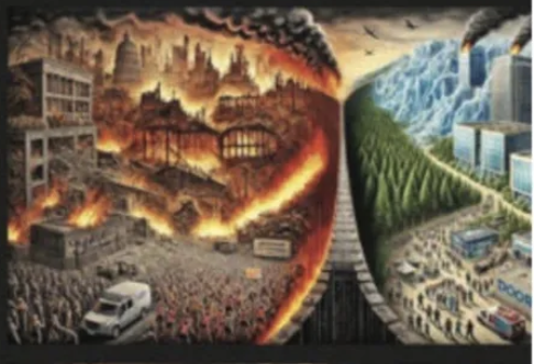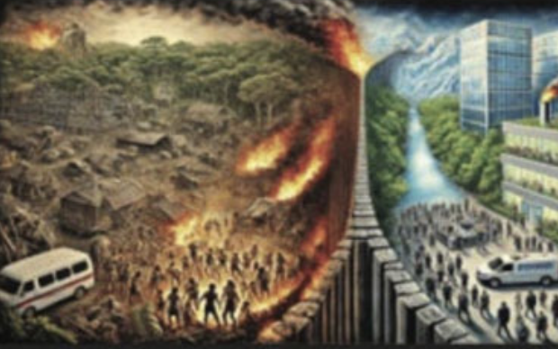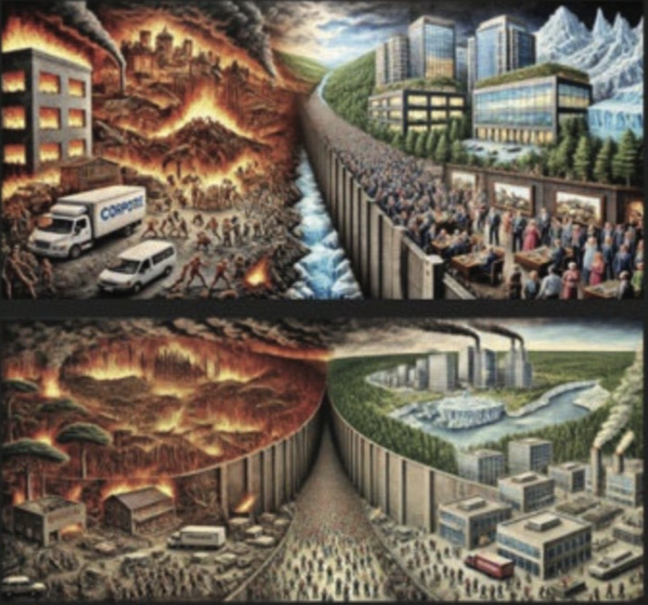 The request the chatbot was given was to depict a city split into two–broken by a grievous class divide–in which the propertied literally partied and chilled as the thick black clouds billowed from the fires that began in forested lands–not much like the areas of Malibu that Mike Davis long ago and so provocatively suggested by let burn. The class divide that animated these scenes were more like a medieval morality play with no clear moral in sight. While the rest of the city was “chilling,” in the request Jonathan Rindernecht asked OpenAI to render on his device. In the image, it seems thousands are fleeing the burning city–long before the actual fires sent residents fleeing after actual Evacuation Alerts. In the images, which almost look like cautionary messages or hateful conjurings, dark smoke blankets the sky. A week after the government shutdown began after Republicans failed to agree upon the appropriations legislation for the coming fiscal year, and emergency response services to disaster response across the nation, with widespread furloughs and cuts in major mitigation and prevention products funded by the Disaster Relief Fund, placing California’s state-wide disaster response abilities in severe jeopardy as they prepare for new threats at the start of fire season, furloughing a full quarter of federal forest service staff in the state, the prosecution of Rinderknecht as the poster boy for criminal negligence fits a pattern of reducing multifactorial problems of fire mitigation to one bad actor, a deviant whose plans were confirmed by the eery nature of the computer generated images of fires he asked to be produce.