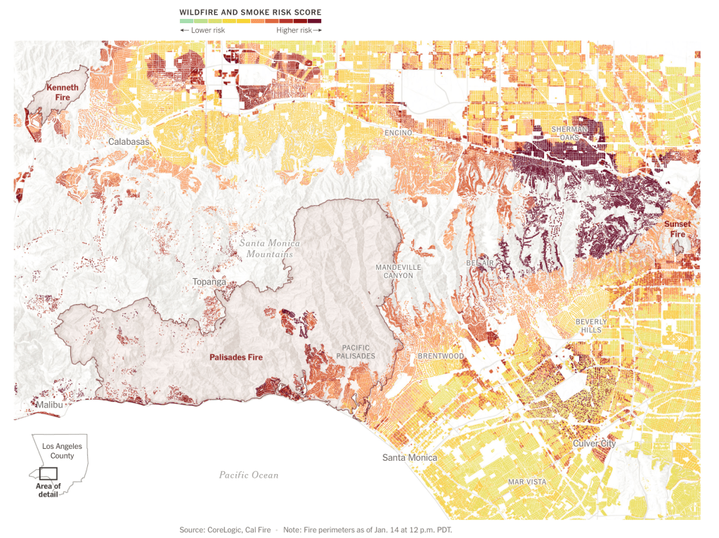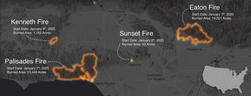 The problem of mapping fires and fires spread in Los Angeles is demanding, challenging, and increasingly frustrating. Exacerbated by the new weather systems of climate change–high, dry winds; dried trees; low groundwater–and the increased combustibility of the landscapes that area among the most treasured in the world, we face so many multi-factorial problems of the origins of any fire that there is no clear smoking gun to place blame. To be sure, before the engines of climate change, we lack the need for assistance to a sprawling urban infrasctructure to provide the water or fire mitigation needed to deal with them.