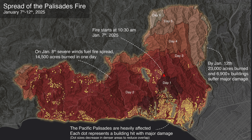 His very spectatorship of the fiery destruction of this exclusive area of Los Angeles made him a flâneur of urban disaster,–not a new type of flaneur, if one that anticipated the spectatorship of the Palisades fires LA residents watched with newfound disempowerment,–stunned ifpassive before the real-life urban spectacle beyond anything they saw on their television screens, rekindled by hurricane-force winds as it spread beyond the Palisades across 23,000 acres to Topanga Canyon and Malibu–pricey locales to live indeed–as well as Altadena, leveling 6,000 structures and actually clearing multiple communities without much distinction of class, even if it seemed to be targeting the superrich living in Pacific Palisades–the name by which the fire became known. The sense of a watching the actualities of such apocalyptic realities unfold in real time was of course different than the scale of spectatorship of the fires that would rekindle form the fire he set, but he was consuming the information he perhaps might have heard on the radio in all its visual intensity, viewing not the effects of the fire’s spread or its map but the flames he had imagined at first hand, as one hears a pyromaniac is vertiginous before, as if it was a sight of the city, even as he tried rather desperately to distance himself from it, by trying to claim he was hardly at fault legally for having created anything like an actual loss of property: