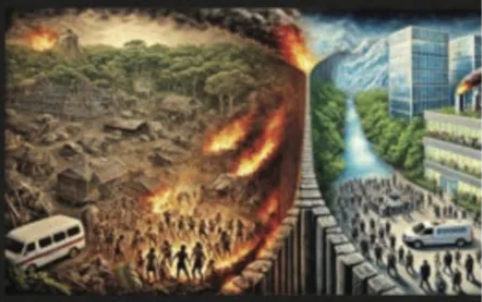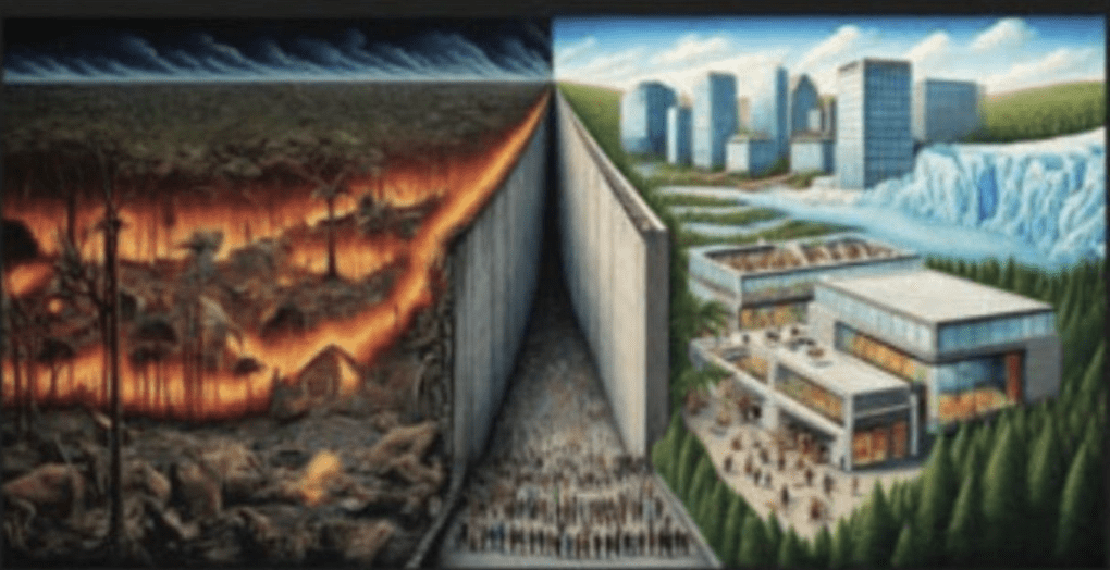 The charge or commission that Rinderknecht gave to ChatGPT was not of a disaster, but a divided canvas, understood in quite pictorial terms, of moral impact. Imagining fires in an urban landscape “divided into distinct parts that blend together seamlessly” is hardly a criminal act. Rinderknecht sought to map the fires to show a featured socioeconomic divide as if the result would be a clearheaded depiction of a socioeconomic divide. He desired a clear contrast between “on the far left, a burning forest” next to which “a crowd of people is running away from the fire” as “hundreds of people in poverty are trying to get past a gigantic gate with a bit dollar sign on it” that symbolized the city’s stark socioeconomic divides: while a “conglomerate of the richest people” relax while “watching the world burn down, and the people struggle” without registering the disaster, “laughing, enjoying themselves, and dancing” per Rinderknecht’s descriptions, asking the chatbot render a nightmarish dream as if for an artistic commission, stipulating that the painting be “detailed and impactful, highlighting the stark contrast and the direct connection between the different parts of the world.” Rinderknecht seems to have sought to make an image that might mend the fences between the glaring economic differences he had trouble living with.
