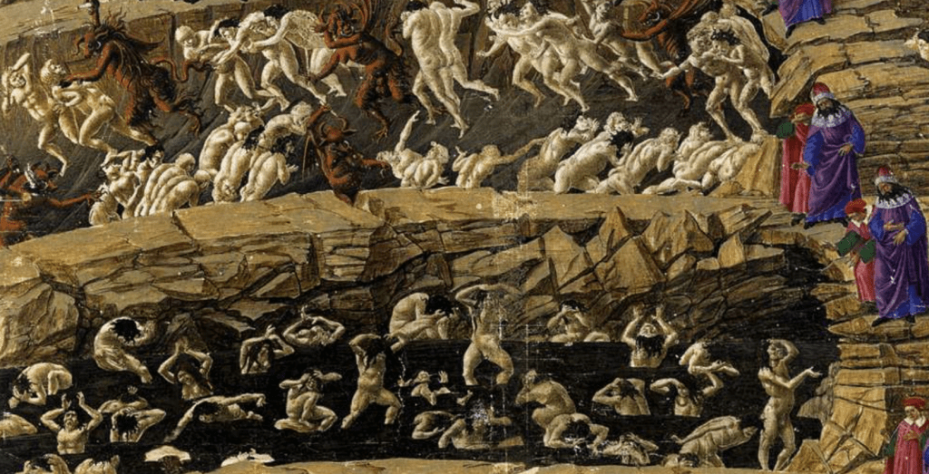 Sandro Botticelli, Dante and Virgil Viewing the Souls of the Damned in Hell’s Eighth Circle, 1480s Canto XVIII