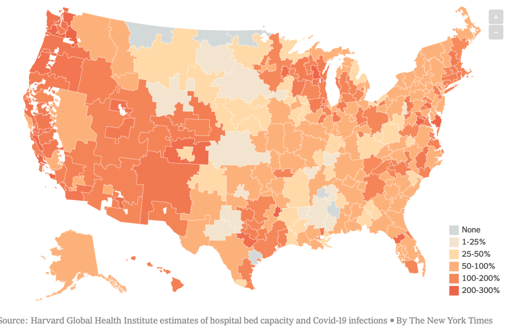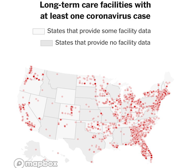 –and the density of Long-Term Care centers of assisted living across the state, which were so tragically long centers of dangers of viral spread, as the New York Times and Mapbox alerted us as the extreme vulnerabilty of elder residents of nursing homes, skilled nursing facilities, retirement homes, assisted-living facilities, residential care homes who cannot live alone was noted across the world. The data that was not provided in the grey-out states interrupted the spread of infections among those often with chronic medical conditions was not surprising, epidemiologically, but terrifying in its escalation of the medical vulnerability of already compromised and vulnerable populations–and steep challenges that the virus posed.