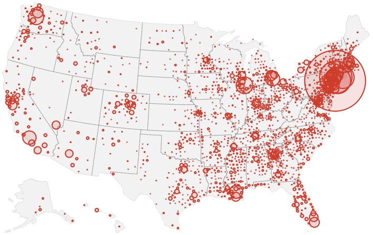We are plowing infections and mortality with abandon in a steady diet of data visualizations that purport to grasp disease spread, that were once weighted predominantly to the New York area, even as they spread throughout the nation by the end of March, but remaining in the thousands, at that point, as even that low threshold was one by which we were impressed. The tracking of the local incidence of reported cases seemed to have meaning to grasp the meaning of transmission, with a pinpoint accuracy that was assuring, even if we had no way to understand the contagion or no effective strategy to contain it. But we boasted data visualizations to do so, focussing on the nation as if to contain its spread in antiquatedly national terms, for a global pandemic, not mapping networks of infection but almost struggling to process the data itself.