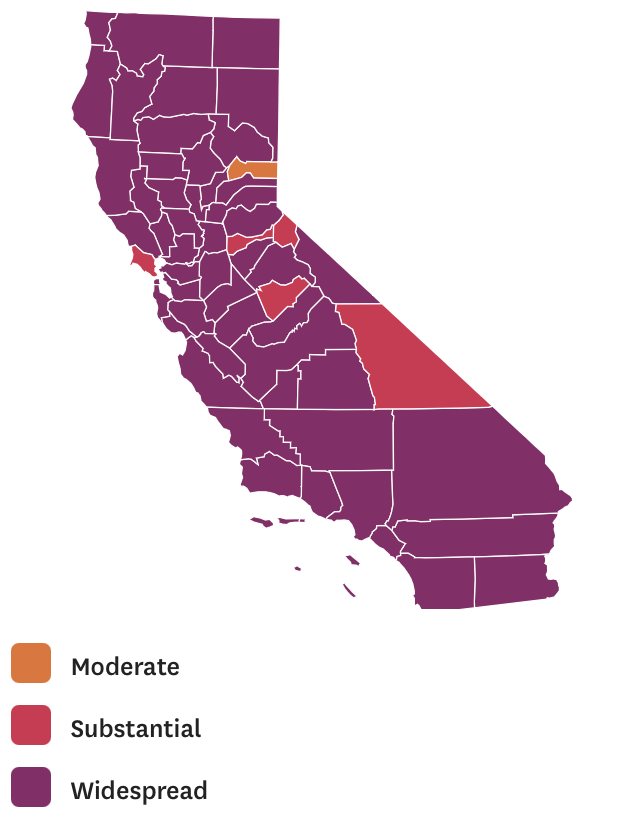 While mapping offers little comfort in the era of saturation of heightened risk, the color-codes alert inhabitants to the danger of increased stresses on the public health system–as much as visualization challenges to translate tools of data aggregation to visualize the pandemic., as December 6 rates grew by December 19. As we shift to map a decreasingly multi-colored state by the moderate, substantial and widespread virus, and widespread cases seem to flood the state, the map offers a security of some sort of monitoring of the pandemic’s spatial spread.