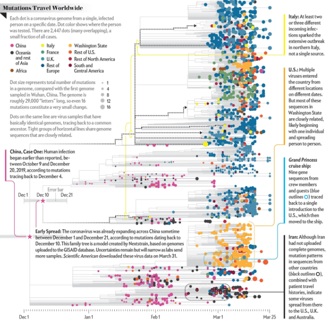 From December 4 2019, indeed, we could track emergent variants of the virus best outside of a spatial scale, as much as it reminded us that the very mobility of individuals across space increased the speed and stakes of viral contagion, and the difficulty to contain viral spread, in the interconnected world where viral variation recalled a flight map, set of trade routes, or a map of the flow of financial traffic or even of arms. Mutations were understood to travel worldwide, with a globalism that a spatial map might be the background, but was indeed far removed, as we moved beyond questions of contact tracing to define different sizes of genomic mutation and modifications that we could trace by the scale of mutations, not only the actual places where the virus had arrived.