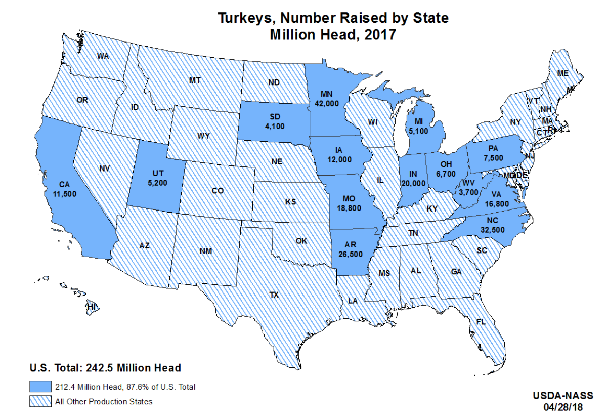 The dramatic geographical concentration of inventories of turkey farms in the United States six years ago already raised questions about the health consequences of such intense overcrowding of poultry farms–even if we don’t seem to measure the concentration of farmed turkey that have grown increasingly concentrated, placing literally millions and millions of farm-bred birds, many raised for the Thanksgiving table, in dense concentrations at factory farms with little sense of the growing worries of public health that such concentrations might cause or provoke, as the demand for the bird long limited to holiday feasting has grown as a “healthy” option and an alternative choice for fresh pet food.