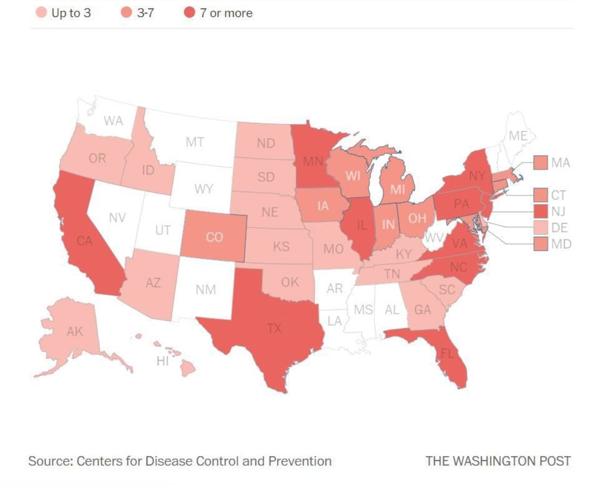 The extent of these fears were readily tapped by recent maps of the feared outbreaks of Salmonella infections from tainted supplies of turkey, transmitted in undercooked meats, that seems poised to threaten to frustrate the harmony of the social potlatch of harvest foods, as warnings of the danger of infectious disease have spread, with Thanksgiving only weeks away, across thirty-five states–in a reprisal of fears the previous year of the first reports of cases of a bacterial strain distinguished by its resistantancn to antibiotics. The discovery and identification of the strain of antibiotic-resistant Salmonella Reading prompted fears for a Thanksgiving outbreak of infections, which rather than mapped with the level of detail that would reflect the detection of the outbreak in sampled raw turkey products from some twenty-two individual slaughterhouses and seven meat-processing plants, were described only in a state-by-state distribution of total reported infections rather than the actual vectors of infectious disease: the Washington Post designed the below infographic to alert its readers to the worries of a spread of tainted turkey meat, coloring states with the greater number of reported infections as if in more underdone shades of meat, but their removal form any sense of the sits of distributors or slaughterhouses concealed rather than clarified.