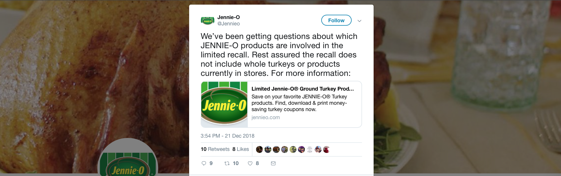 The Thanksgiving plate seems a vestigial reminder of the harmony of the food cycle. While it is enough of a soothing celebration of something with its own complex feng shui to be the background of Jennie-O tweets, the gemütlichkeit of Thanksgiving and myth of the dinner supports a gastronomic reminder of domestic harmony is upset by the increased numbers of infections of turkey in ways that warrant national announcements and concerns from the CDC; each plate on the table is set in perfect order, as an image of the harvest is gathered in a sort of counterpoint on one’s own meal plate. But the harmony of that microcosm was disturbed by seasonal warnings of dangers of infections that this time arrived with increased urgency during the Great Turkey Recall of 2018. Ground turkey continued to be recalled by Jennie-O to the tune of over 164,000 pounds as the salmonella outbreak continued, amidst fears of a government shutdown. And even as fears of troop withdrawals from Syria and Afghanistan raise deep concerns for he nation, the infectious outbreak widened by Christmas, leading producers to assured consumers that the lots of contaminated meat were labeled P-579, to preserve the healthiness of farmed turkey as warnings about Salmonella spread over half the states in the union, and only a small portion of the Salmonella outbreak strains in the nation that had already occurred by 2017, believed to derive from contact with live poultry or uncooked poultry parts in the nation.