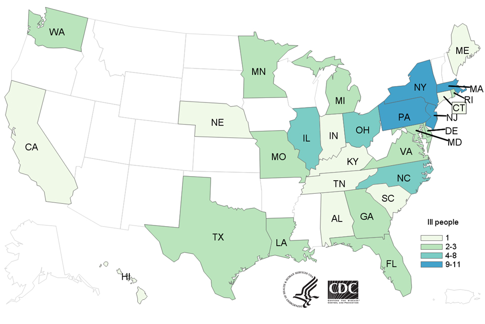 The initial warnings of Salmonella poisoning of “all-natural” turkey meat gave alarming immediacy on the eve of Thanksgiving, when turkeys would be arriving in refrigerators nationwide, on their way to ovens, kitchen counters, sinks, and eventually reach their destination on household tables. As infections spread to thirty-five states, the constellation of states which saw over seven infections–New Jersey, Pennsylvania, Florida, Illinois, Minnesota, North Carolina, Virginia, Texas and California–provided testimony to the threat of actual infection of the nation, that spread from turkey processing plants often located at a distance from factor farms where most farmed turkeys are raised in crowded conditions.