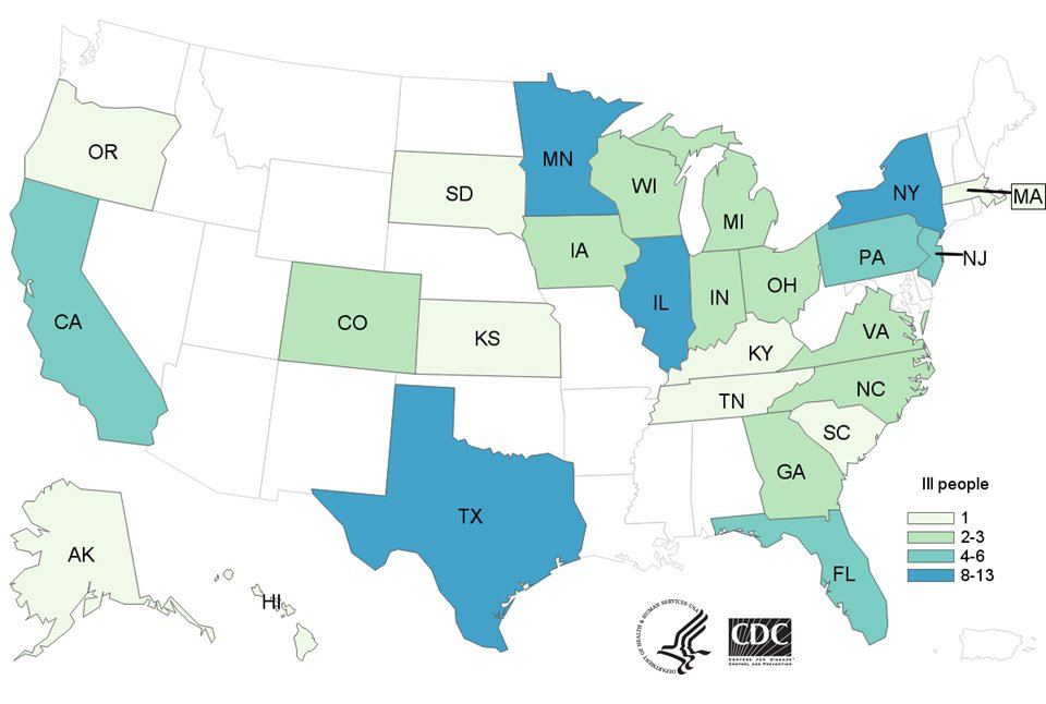 –designed to recall the shades of uncooked meat that offer the clearest subliminal message of the vectors of infection, all of a sudden giving it an immediate narrative of local poisoning–even if the “map” is far from geographically or epidemiologically specific in its state-by-state breakdown of the “breakout” of the disease–and seems a teaser to imagine the potential future epidemic of the consumption of a spate of undercooked holiday turkey.